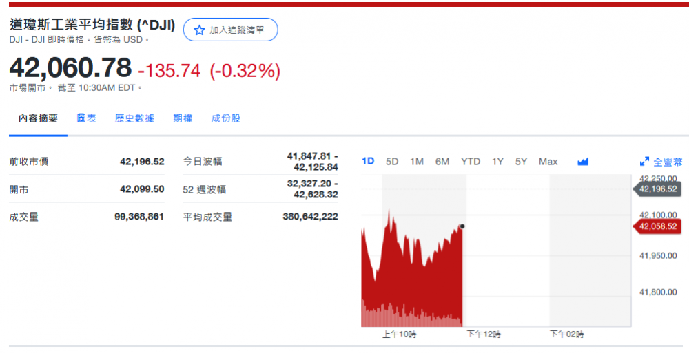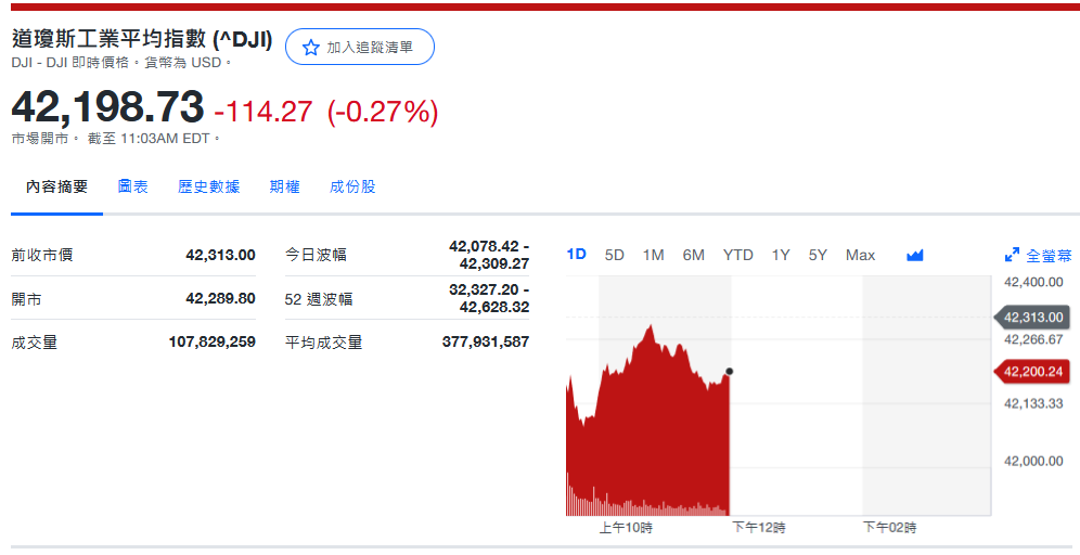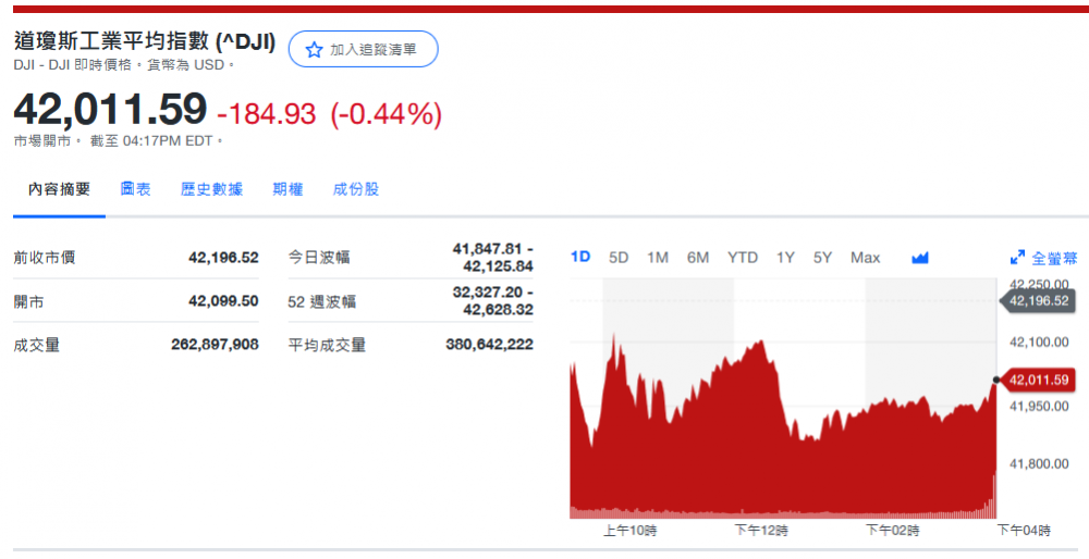 道指收42,011.59-184.93 (-0.44%)