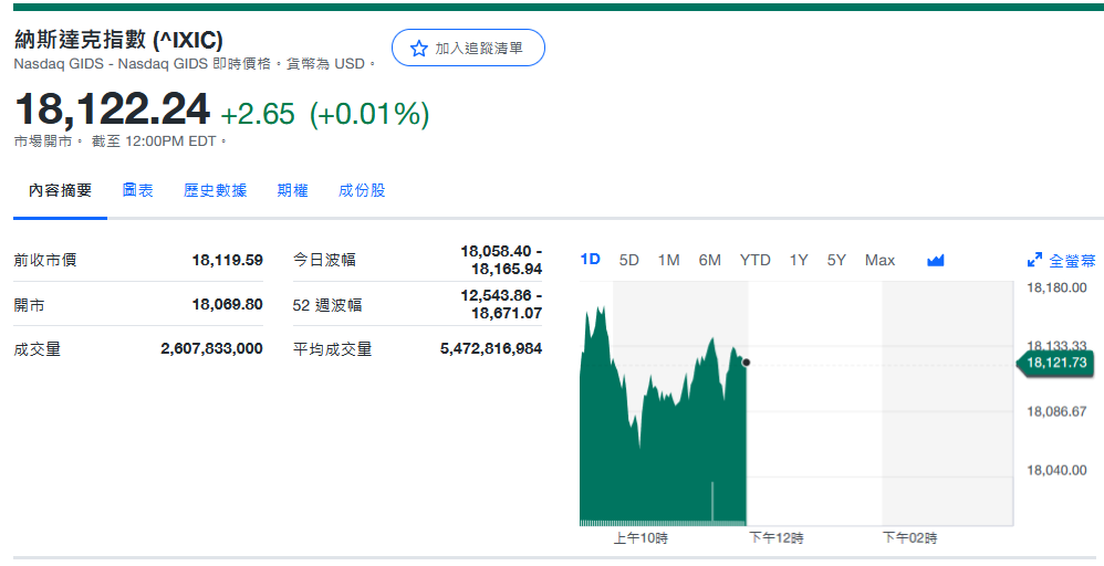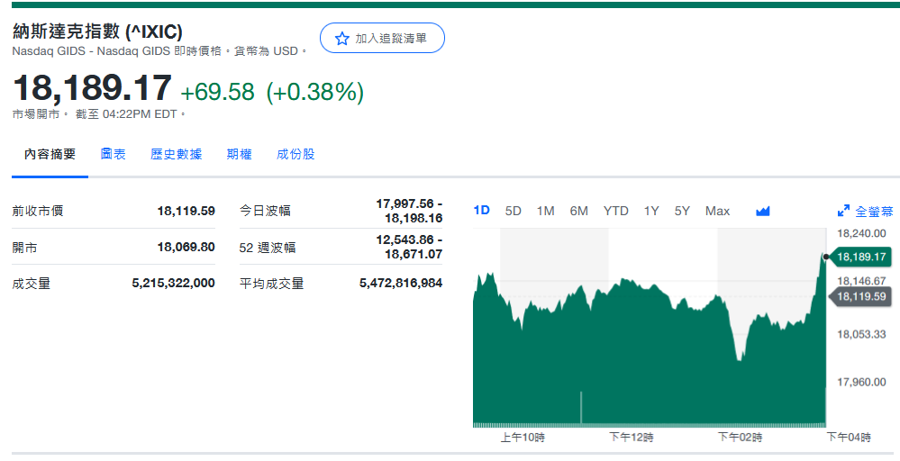纳指收18,189.17+69.58 (+0.38%)