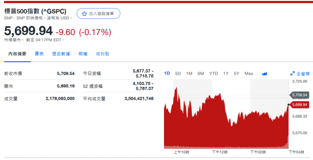 标普收5,699.94-9.60 (-0.17%)