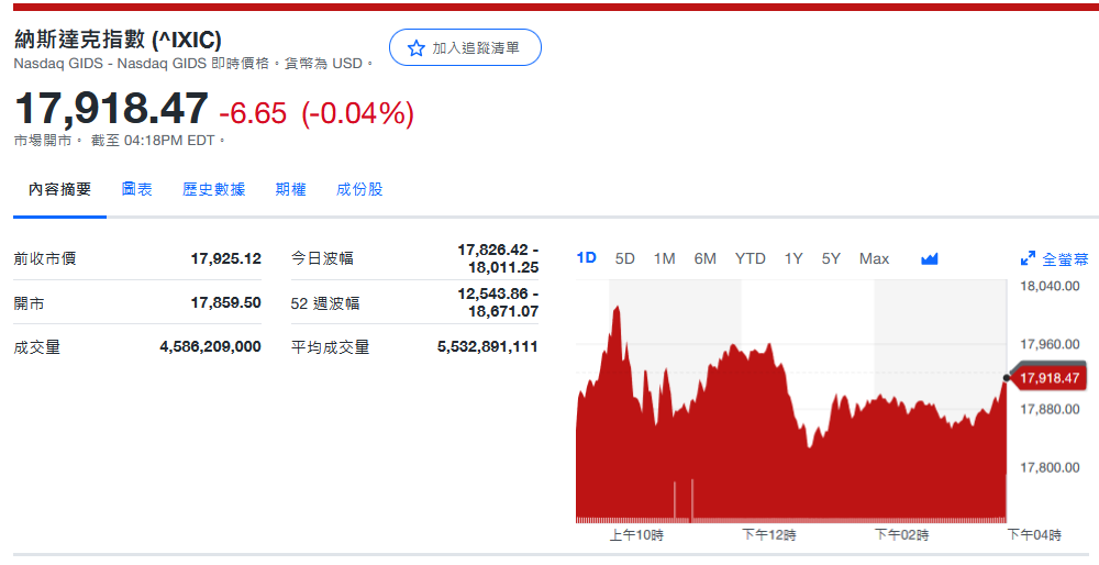 纳指收17,918.47-6.65 (-0.04%)