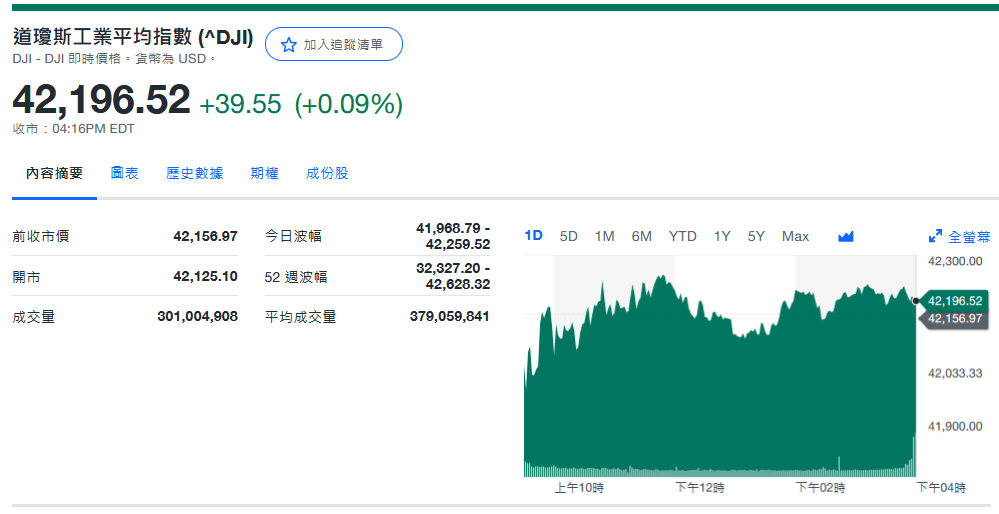 道指收42,196.52+39.55 (+0.09%)