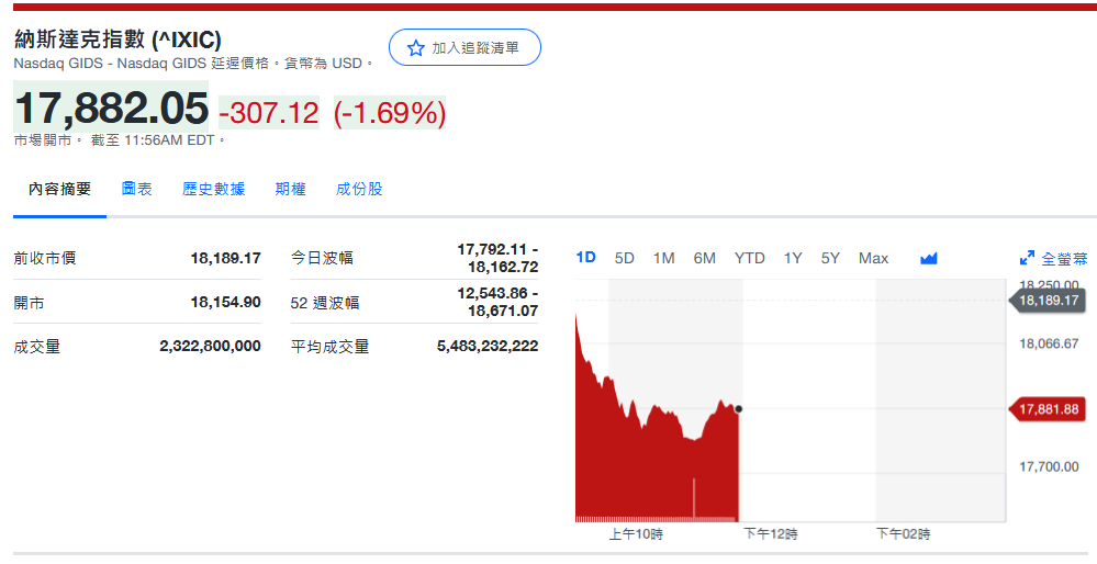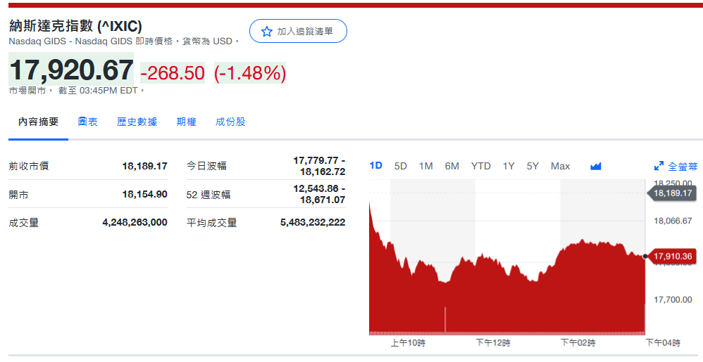 纳指收17,910.36-278.81 (-1.53%)