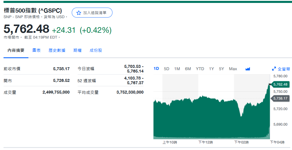 标普收5,762.48+24.31 (+0.42%)