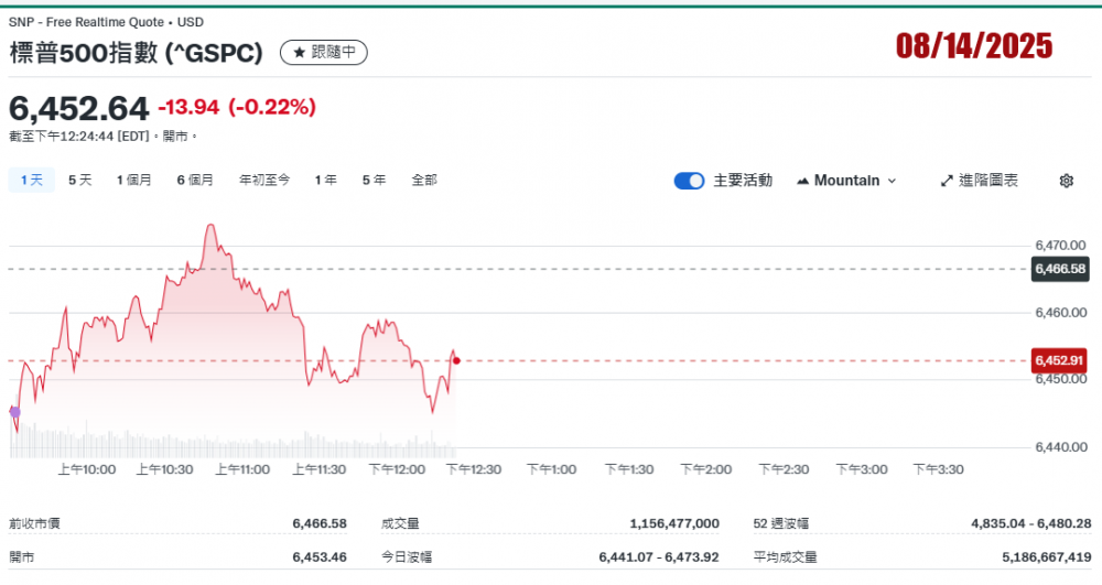 2025年8月14日美国股市收盘记录。三大指数小跌收盤。标普再创新高。