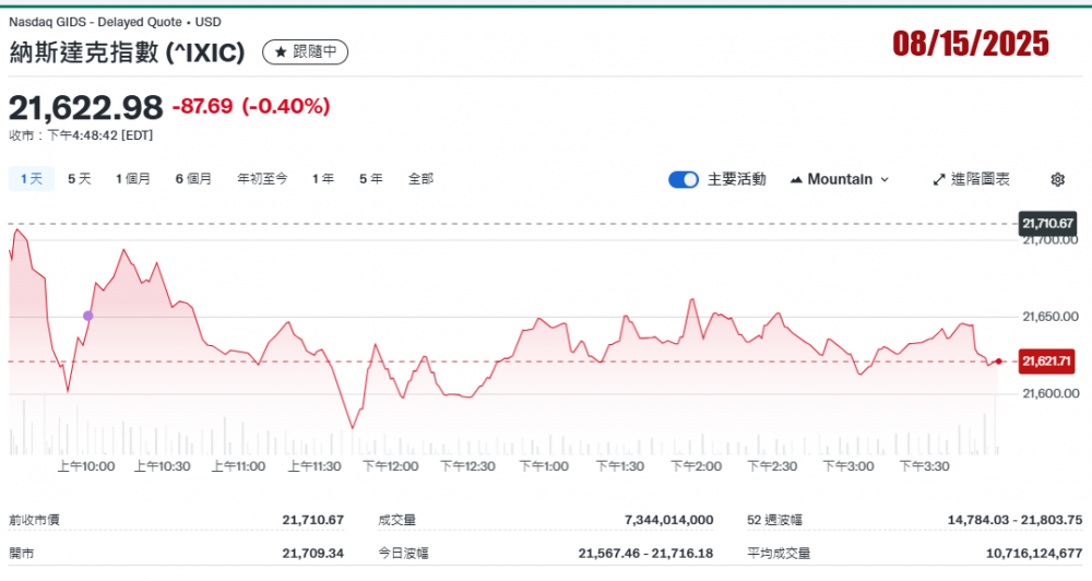 2025年8月15日美国股市收盘记录。三大指数涨跌不一收盤。