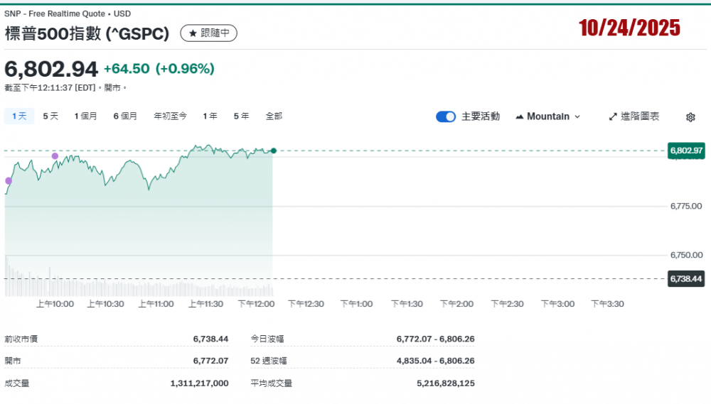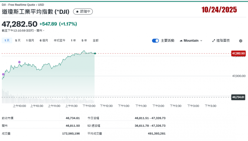 2025年10月24日美国股市记录。三大指数上涨。三大指数再破盘中记录。