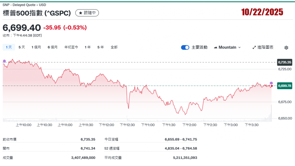 2025年10月22日美国股市记录。三大指数全部下跌。