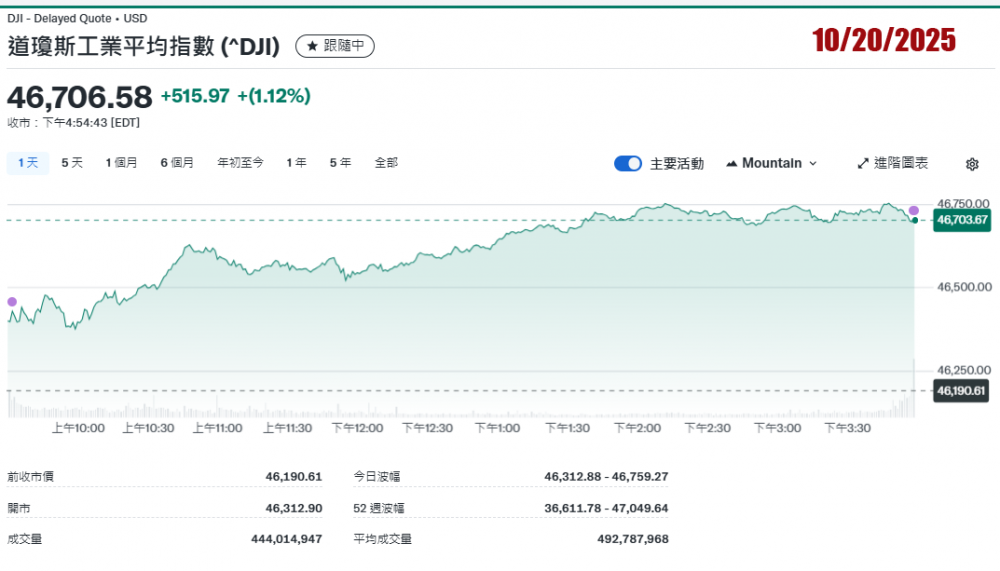 2025年10月20日美国股市收盘记录。三大指数大涨收盘。