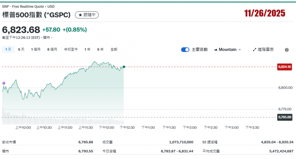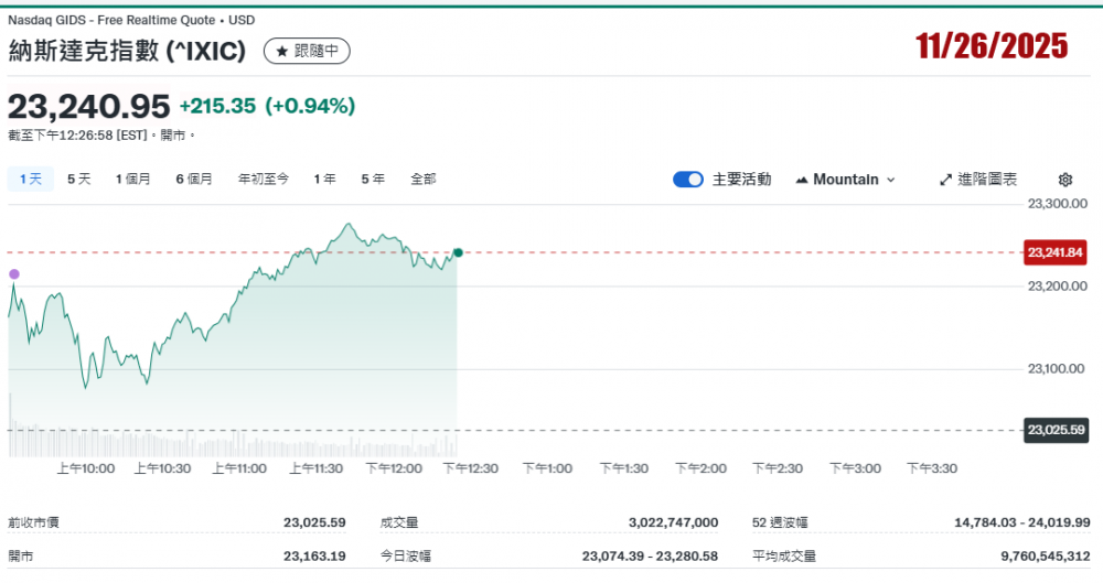 2025年11月26日美国股市收盘记录。三大指数上涨收盘。