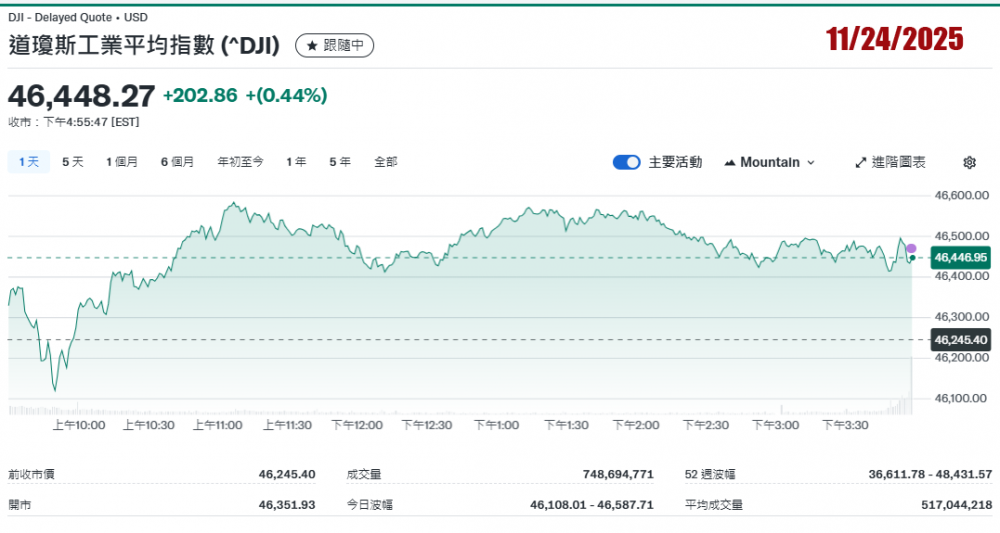 2025年11月24日美国股市收盘记录。三大指数上涨收盘。