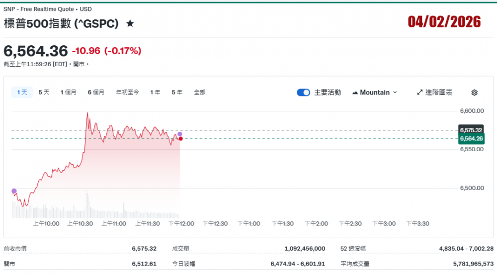 2026年04月02日美国股市记录。道指收46,504.67。标普收6,582.69。纳指收21,879.18。