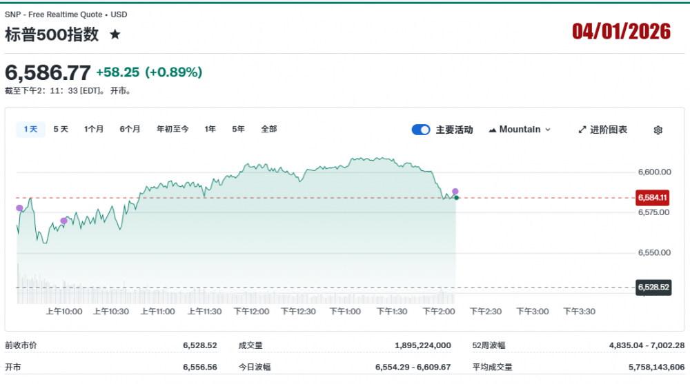 2026年4月1日美国股市记录。三大指数上涨。
