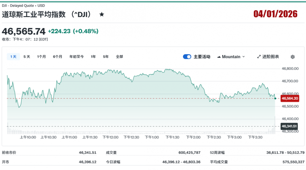 2026年04月01日美国股市记录。道指收46,565.74。标普收6,575.32。纳指收21,840.95。