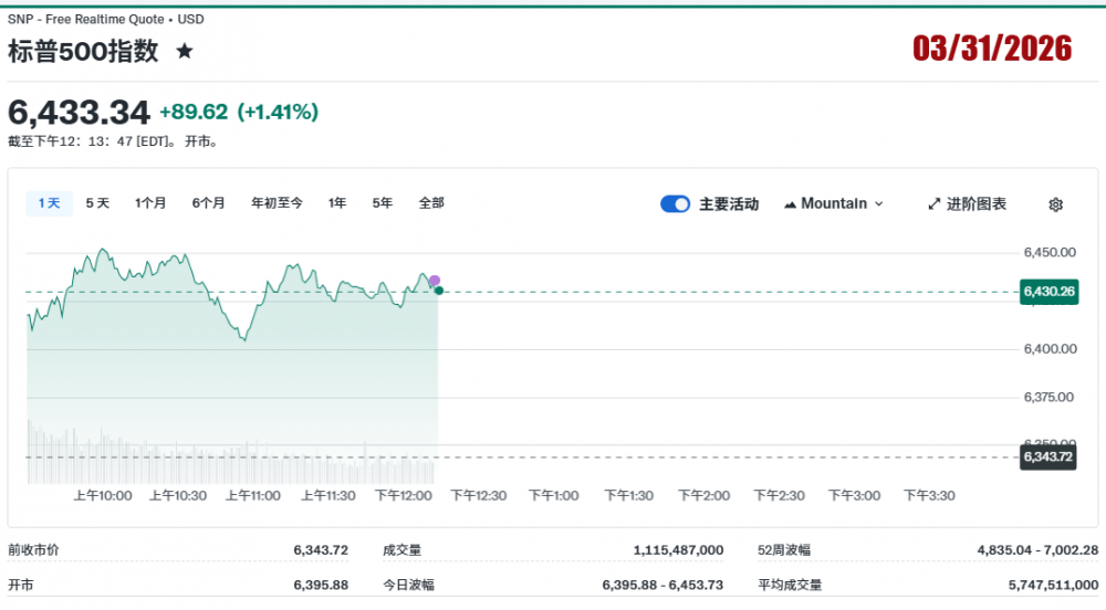2026年3月31日美国股市收盘记录。三大指数大涨收盘。