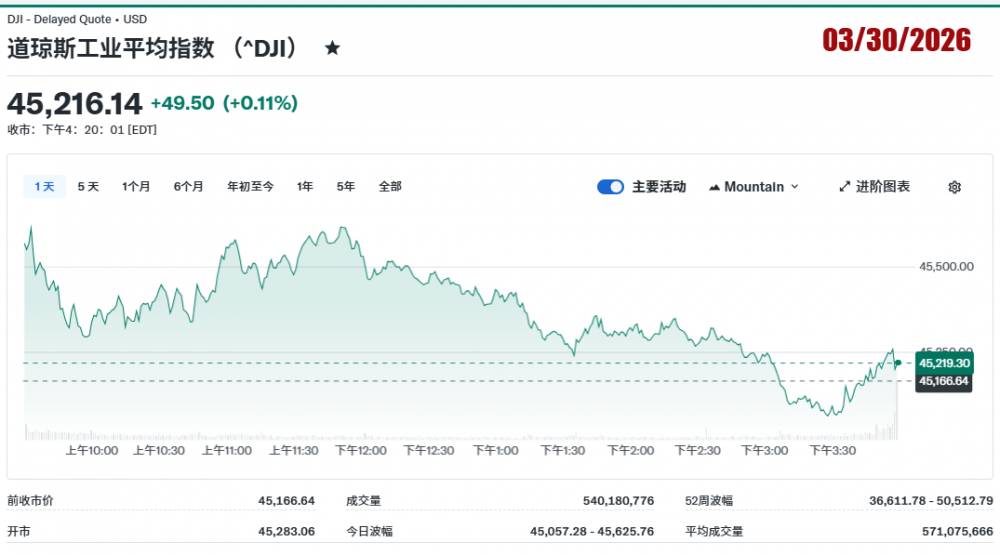 2026年03月30日美国股市记录。道指收45,216.14。标普收6,343.72。纳指收20,794.64。