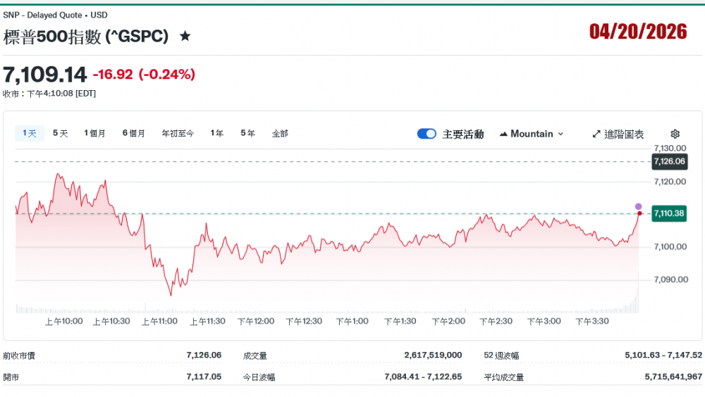 2026年4月20日美国股市收盘记录。三大指数下跌收盘。 道指收49,442.56-4.87(-0.01%) 标普收7,109.14-16.92(-0.24%) 纳指收24,404.39-64.09(-0.26%)