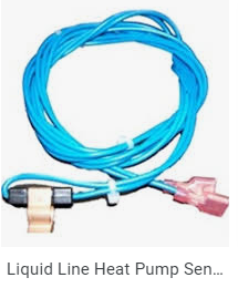 2)上周天气暖和,可我发现热泵完全没有启动过。零上的气温,调高温度试,也只有暖炉启动制热。只好又打电话给代理,他们让检查,控制器是不是设在了EM Heat紧急制热,或者控制热泵的电源breaker断路器是不是忘了开了。答案都是否定之下,只有又派人这周二过来检修了。里里外外检查了一番之后,换掉了室外的热泵的一个蓝色的两头带东西的cable,说那是个用温度来控制热泵启动的传感器 liquid line sensor (如下图)。换好装回盖板,一试,果然启动了。
