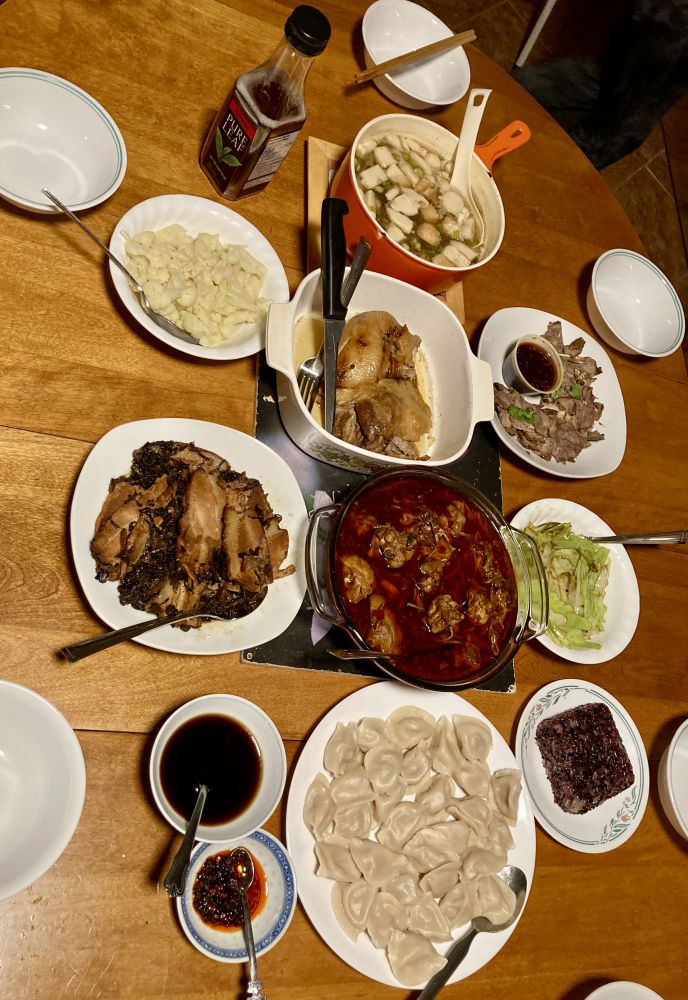 因为小子叫了几个同学过来,体验中国年夜饭,不得不有几个菜。肥肠鸡、梅菜扣肉、卤牛肉、无骨烤鸭、海鲜Miso Soup、手撕包菜、菜花;主食:米饭、饺子;甜食:八宝饭。