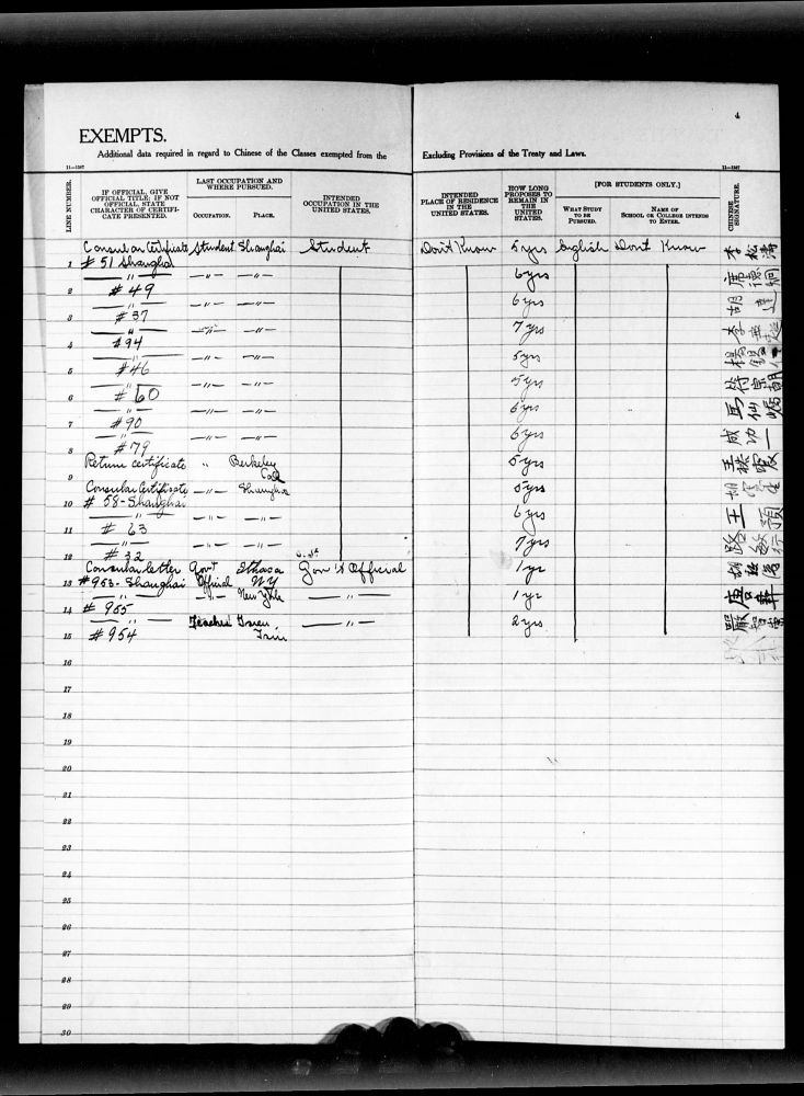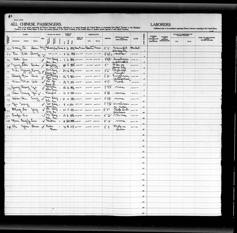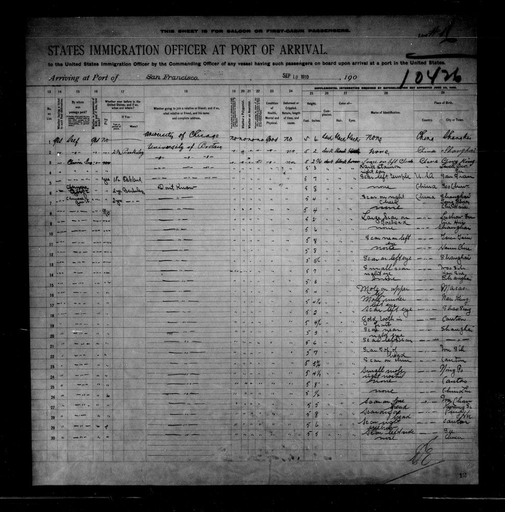 这些档案存于2个系列中,一个是旧金山移民局1903年到1947年的华人入境记录,包括一组按时间排列的文档;另一个是轮船公司乘客名单系列,其中又分两种,因为在那个实行排华法案的年代,华人入境美国要接受专门审查,所以轮船公司必须提交单独的华人乘客名单,而全体乘客名单中,却仍然包括华人,这两份名单包含的信息并不完全一样,因为对华人要进行分类,劳工、美国本土出生、过境、学生教师、商人或者政府官员等等,全体乘客名单则没有这样的区分。乘客名单系列,同样包括一组按时间顺序排列的文档。所以,入境美国的华人的名字,会出现在三个地方,一个是海关移民部门的记录,一个是轮船上全体乘客名单,第三个是华人乘客名单。