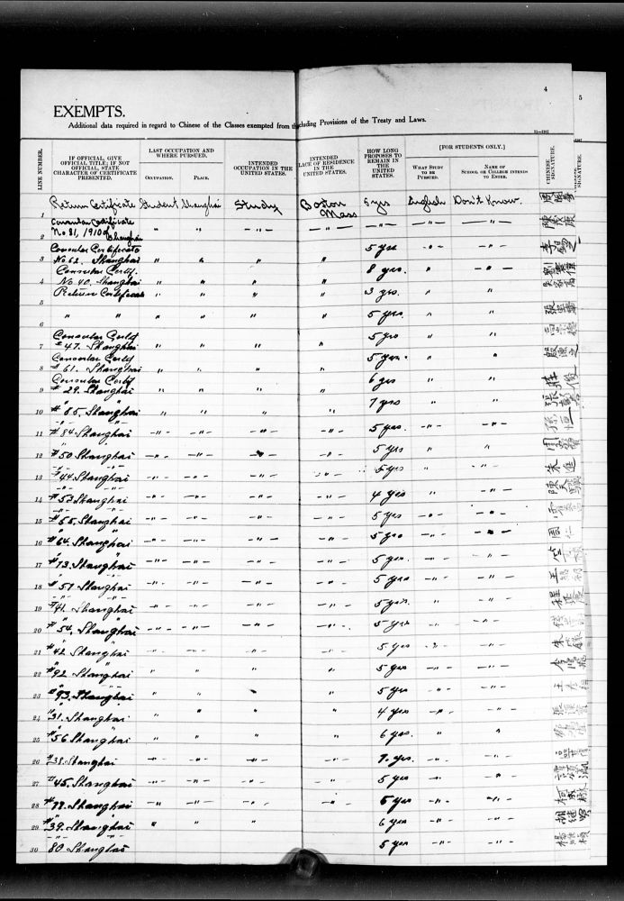 移民局档案显示,这批留学生中周开基、吴家高、张宝华和王裕震四人的类别栏填的是returning student,即返校生,与其他人填的“section 6 SS”不同。这似乎说明这四名学生1910年9月这次不是第一次来美国。四人中目前发现周开基确实在1908年来过美国,见移民局系列中这份文档:October 28, 1907, SS Asia - November 22, 1908, SS Mongolia(ID=102050895),其中第100图,船名西伯利亚号邮轮,1908年2月28日抵达旧金山港,该图记录了12名留学生,最后一名即Chow Kai Chi,周开基。轮船公司乘客名单系列中相应的文档:November 28, 1907, SS Korea - May 14, 1908, SS Siberia(ID=120132630)中第335图,记录的同一次航行,上有“周开基”中文签名,正式的记录在第336图,姓名拼为Chow Ki Chi,目的地是Yale College。这是比较独特的现象:庚款留美学生中,有人之前就在美国大学里学习,并非第一次去美国。至于这几名学生最初到美国留学,然后中途回国,参加1910年庚款留美学生的选拔考试的过程和具体情况,有待中文资料的补充和研究。在此次华人乘客名单中,“意欲前往的学校”一栏,他们与其他初次赴美的学生一样,都填了“未知”(Don't know),他们只是在填表时从众,还是真的要重新选择学校?最后他们去了哪些学校,也有待研究。这批留美学生中,还有施赞元于1904年赴美国就读华盛顿的中央高等学校(据《游美同学录》1917版),实际上是高中,所以不算就读大学课程,与周开基不同。这些之前在美国生活学习过的学生,在庚款留学生选拔考试中,在英语和现代学科方面肯定比没有出过国的学生有很大优势。在轮船公司的全体乘客名单中,刘寰伟的记录中的国籍填的是美国,他是美国公民。