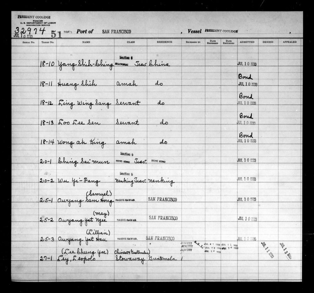 吴贻芳的记录在NARA网上的这个文档:November 3, 1931, President Jackson - November 21, 1934, President Coolidge(ID=102068303),p509,柯立芝总统号邮轮(President Coolidge),1933年7月10日抵达旧金山,