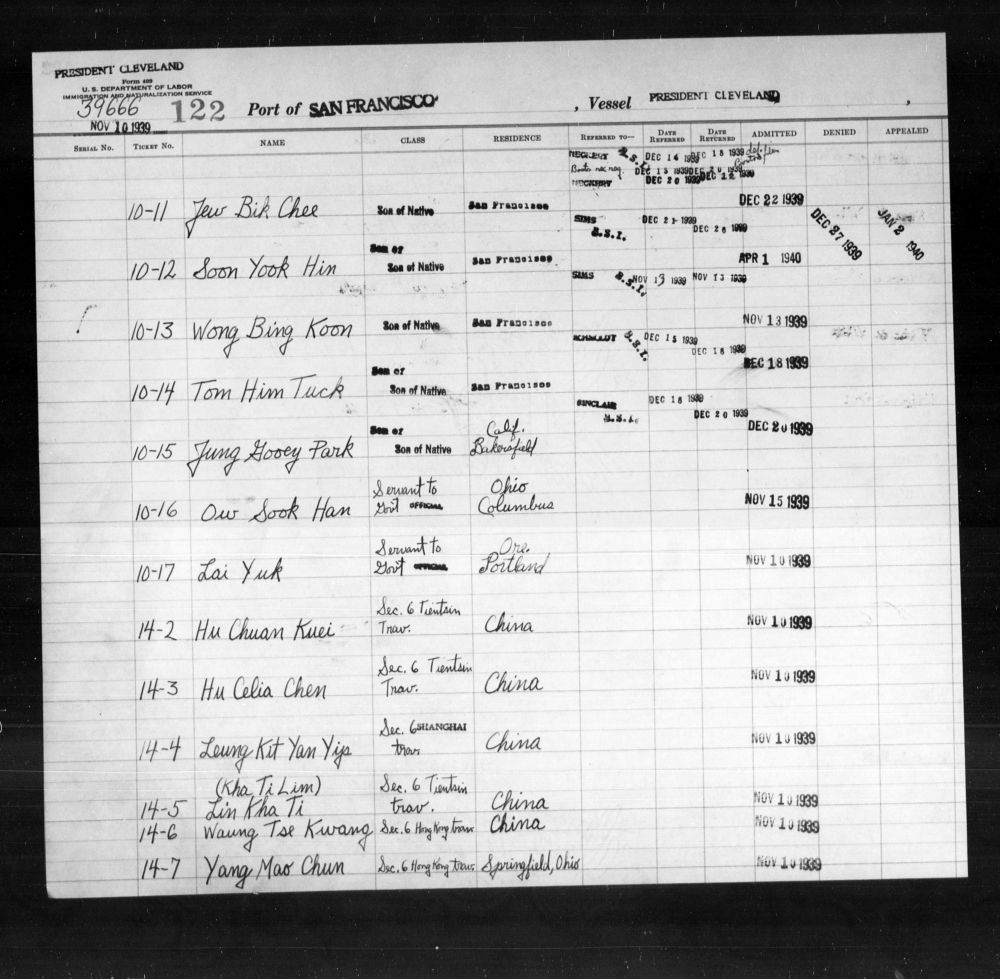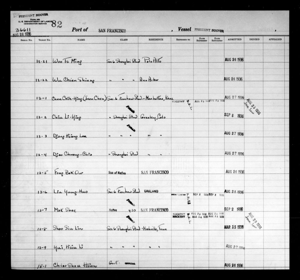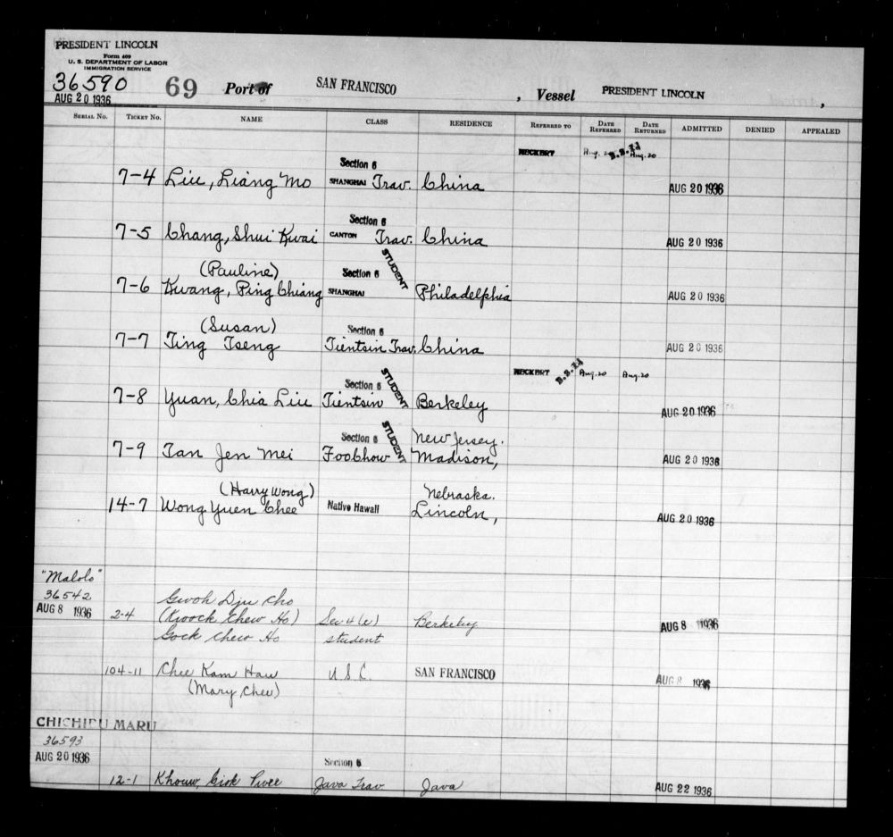 Wu Chien Hsiung Sec 6 Shanghai stud Ann Arbor Aug 26 1936,她是第6条款上海学生,去Ann Arbor,安娜堡,应该是上密大,当天准入。同船的有若干其他学生。Familysearch上,该船是8月11日从上海启航,吴健雄 24 女 单身,出生于Linho,按吴生于江苏太仓浏河镇,Linho当是Liuho,旅费自付,联悉人是父亲Wu Dzong Ie,百度百科里她父亲名吴仲裔,Linho,浏河,吴健雄确实是去上密大,她身高5‘2。