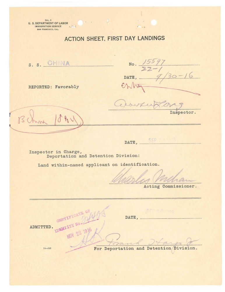船名:China--中国号,No--号码:15597/22-1,这也就是袁世庄的档案号,按照前面讲过的档案号生成法则,15597是中国号邮轮此次航行的号码,22是袁所在乘客名单的顺序,即轮船公司乘客名单第22份,1指她是该份名单上的第1位。接下来日期:1916年9月30日,然后Reported:Favorably,上报意见:同意。下面是审查官(Inspector)签名。再下面是遣返与羁押处(Deportation and Detention Division)审查长(Inspector in Charge)的意见:申请人经确认后登陆(Land within-named applicant on identification),下面是代理局长(Acting Commissioner)签字。