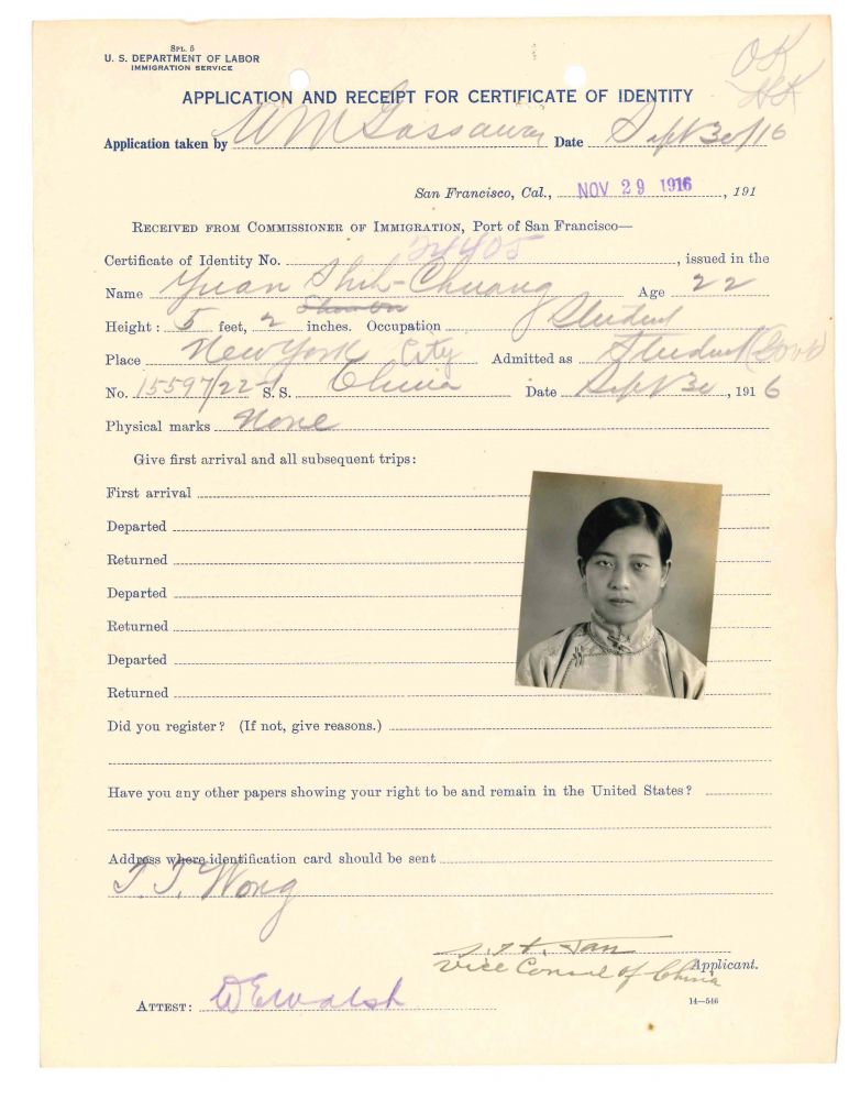 袁世庄是1916年清华女生,赴美留学,于1916年9月30日,乘坐中国号邮轮抵达旧金山。除了入境时的记录外,NARA网上还有她的个人档案,“Yuan, Shih Chuang - Case Number: 15597/22-1 - Ship of Arrival: CHINA, 09/30/1916”(ID=28832175,用此ID到NARA网上搜索页可搜到)。该档案只有4页: