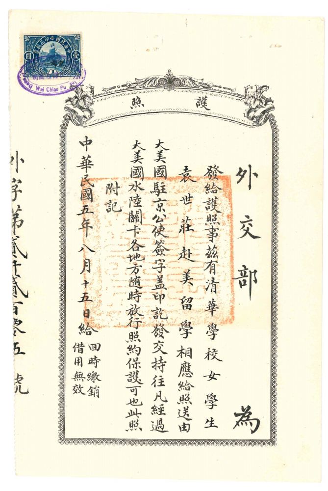 第三页也有一张照片,与第二页的不是同一张。这页与第四页是一起的,第四页是中国政府发的护照,全中文,第三页是北京的美国领事馆为此护照处具的证明,日期是1916年8月18日。下面是美国公使(minister)的签名,查1916年,美国驻中国公使是Paul Samuel Reinsch,辨认签名,确是其人。照片处盖有一个身份证的章,与上同。