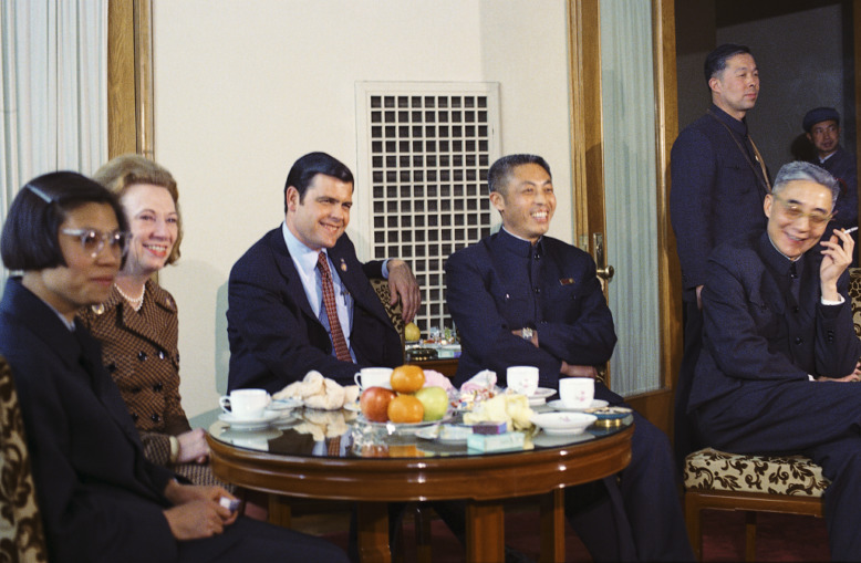 左起,王海容,Rose Mary Woods,Dwight Chapin,韩叙,乔冠华,后面站者不详。