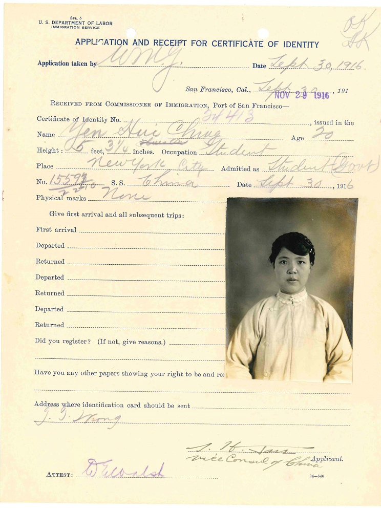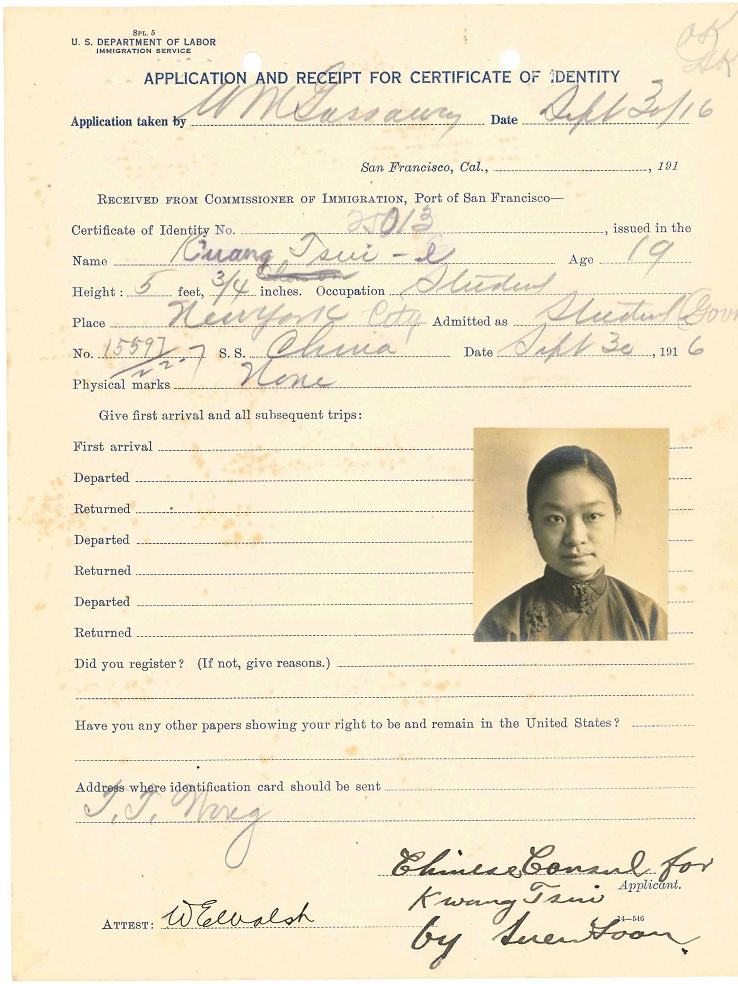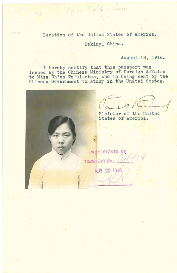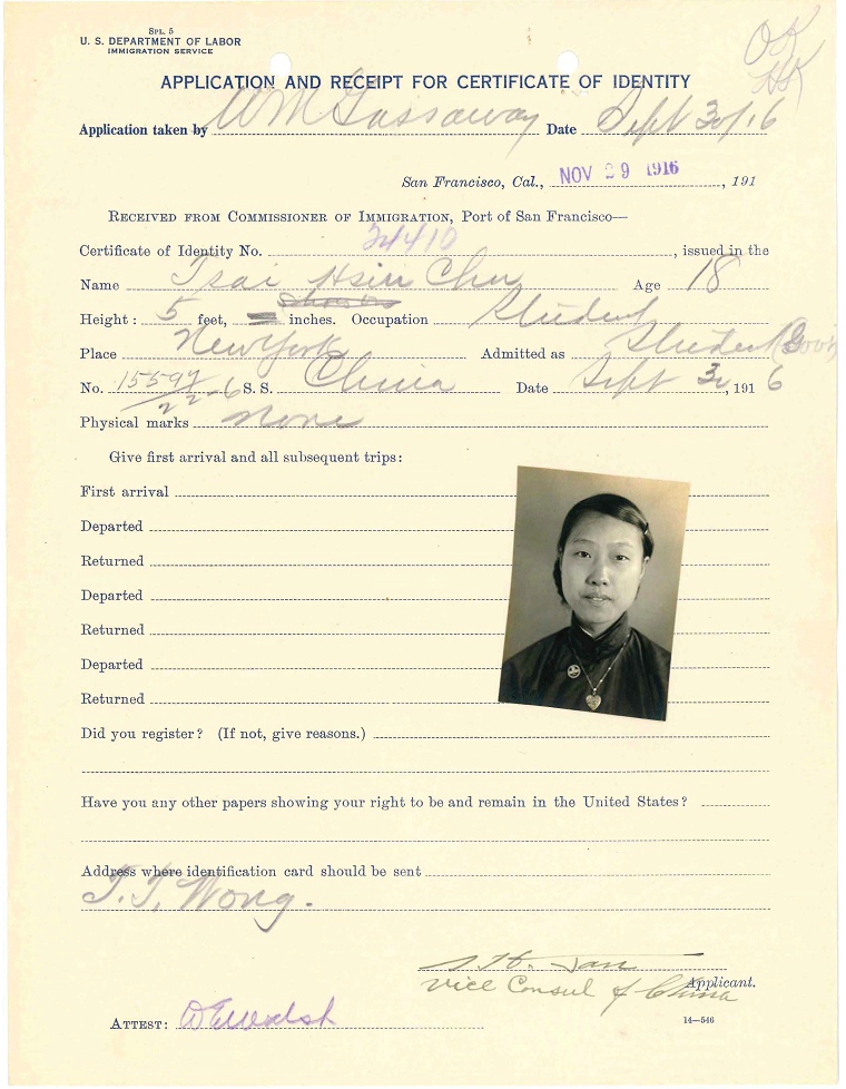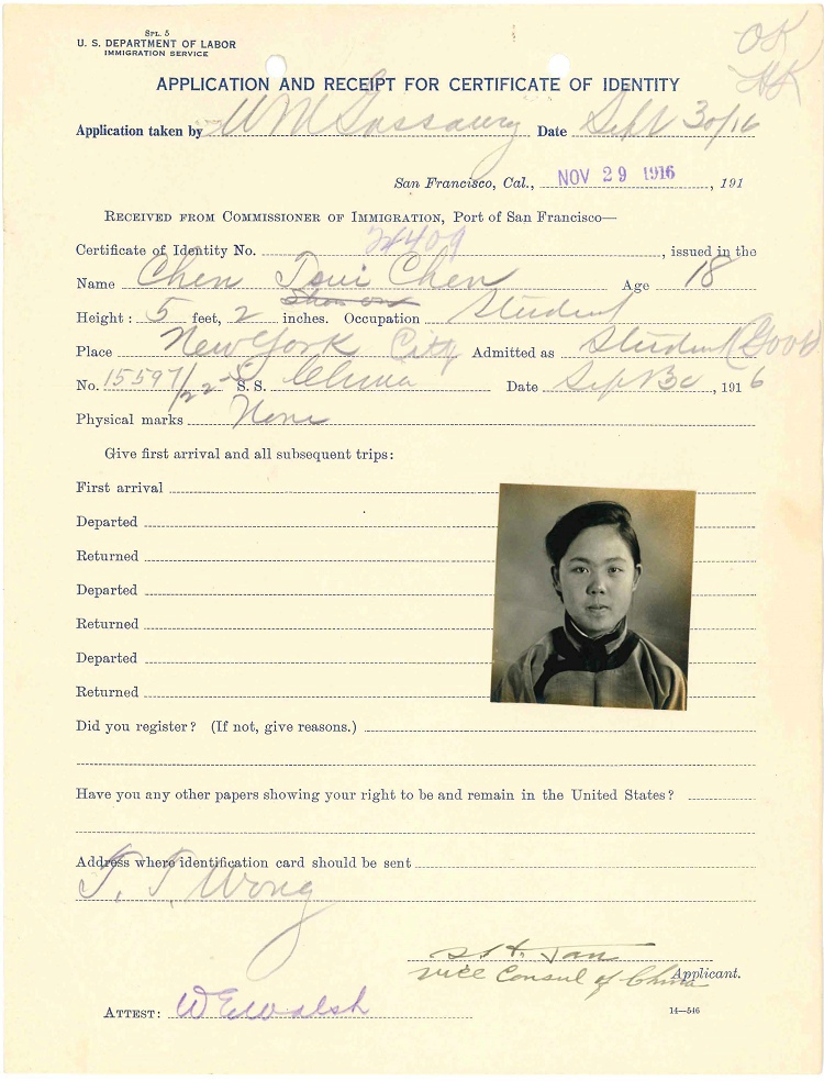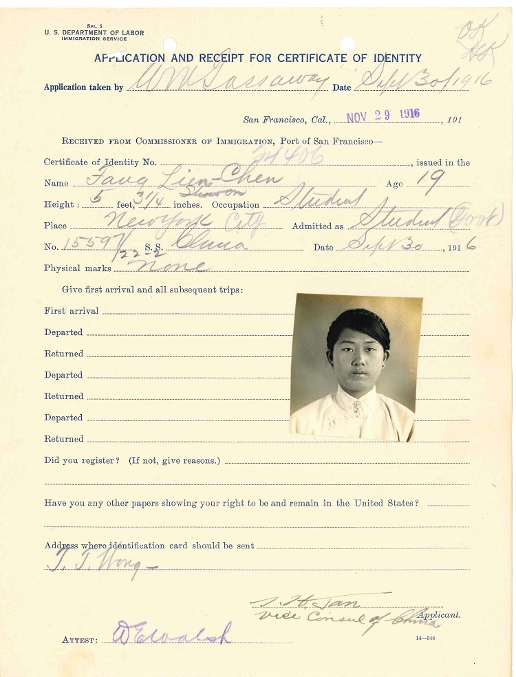 第5名, 陈翠贞,18岁,Chen Tsui Chen,档案名称:Chen, Tsui Chen - Case Number: 15597/22-5 - Ship of Arrival: CHINA, 09/30/1916 (ID=28832203),4页,与袁世庄相同。她联系人:Mrs.Mary Pan(或Fan?)Chao Fung Rd do,也是上海,Chao Fund Rd. 生于北京。
