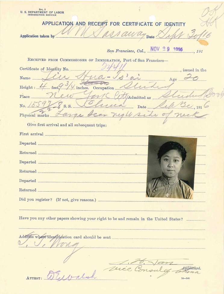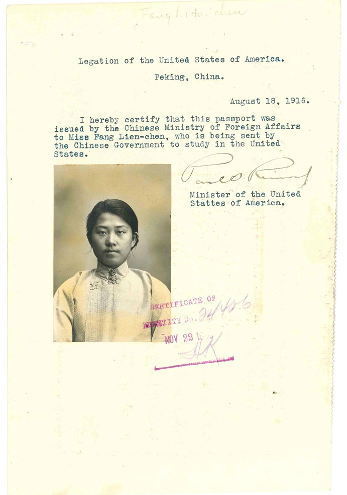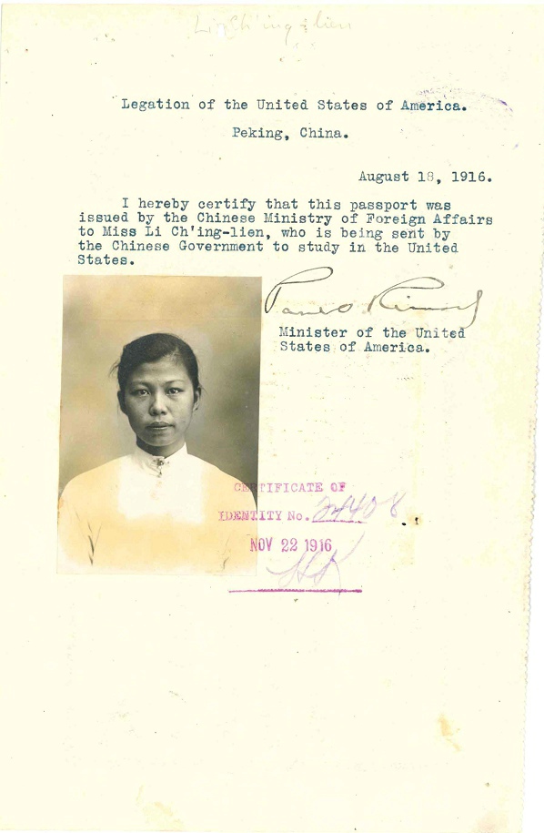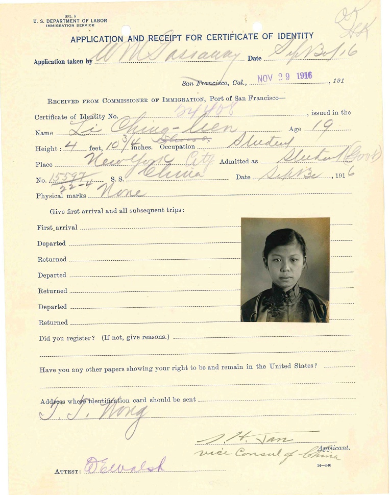 第4名,李清廉,19岁,Li Ching Lien,NARA上档案名:Li, Ching Lien - Case Number: 15597/22-4 - Ship of Arrival: CHINA, 09/30/1916(ID=28832202)。李清廉生于美国夏威夷的三明治岛(Sandwich Island),但是她1916年入境美国时在“之前是否到过美国”栏里填的是没有,可能那个时候,夏威夷还没有并入美国。她的档案有7页,除了4页与其她人一样外,多了3页,这3页是因为1940年有一个叫John Li(又名 Li Jin)的人在纽约入境,纽约移民局对他进行调查,他父亲叫Li Chin Leong(或Leang),或者Li Tsing Liang,父亲的姐妹叫Li Chin Lyan,纽约方面只知道这个Li Chin Lyan1917年在麻省的Andover上Abbott Academy,1924年在Worcester,之后情况就不了解了,所以写信给旧金山移民局。于是旧金山移民局提供了一份李清廉1916年入境证明(Certificate of Admission),旧金山方面不知此人是否就是纽约方面要找的人,只是附上供参考。这些按下不上了,还是上有照片的2页和护照。FS上,李清廉联系人是Dr.T.M.Li 91 Paoshing Rd Shanghai。