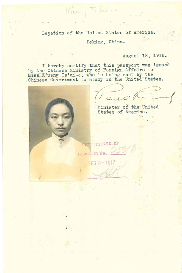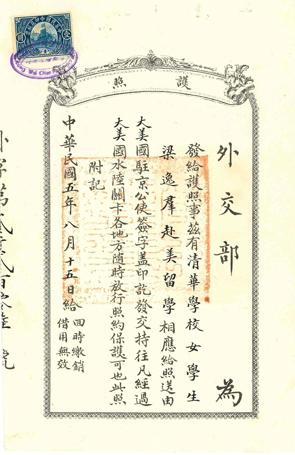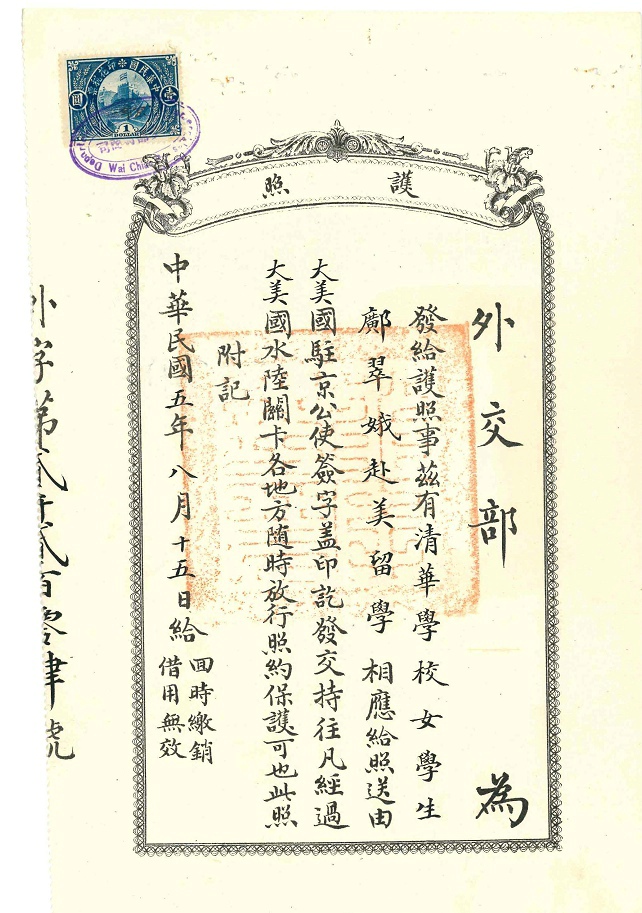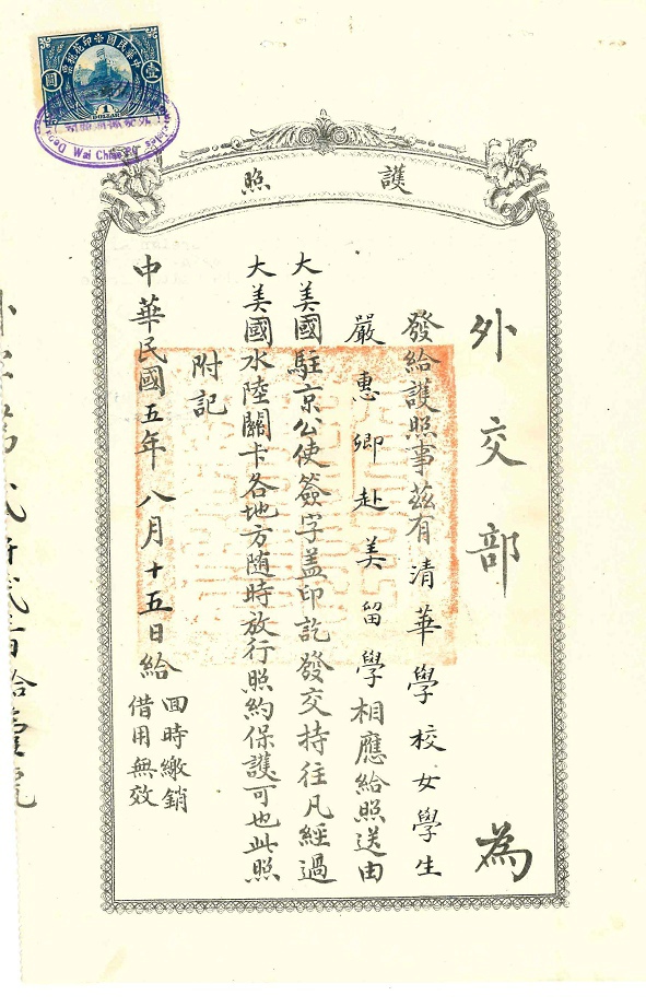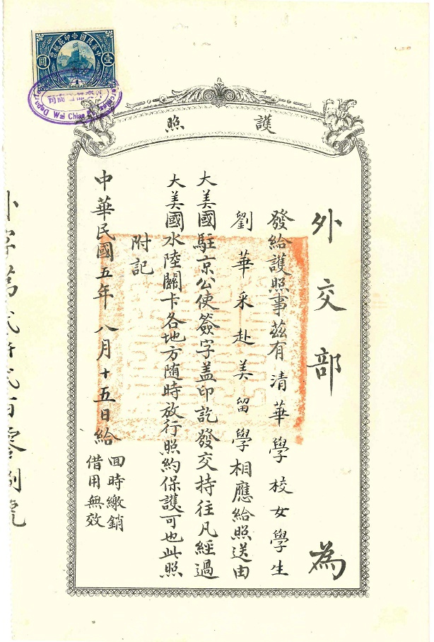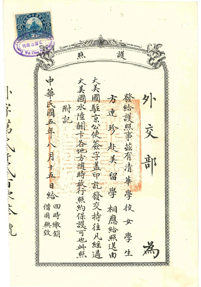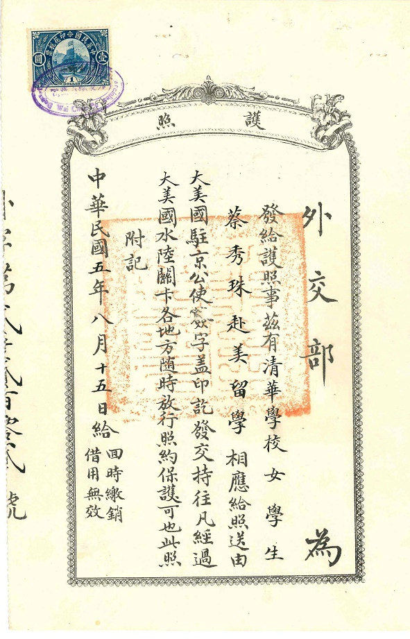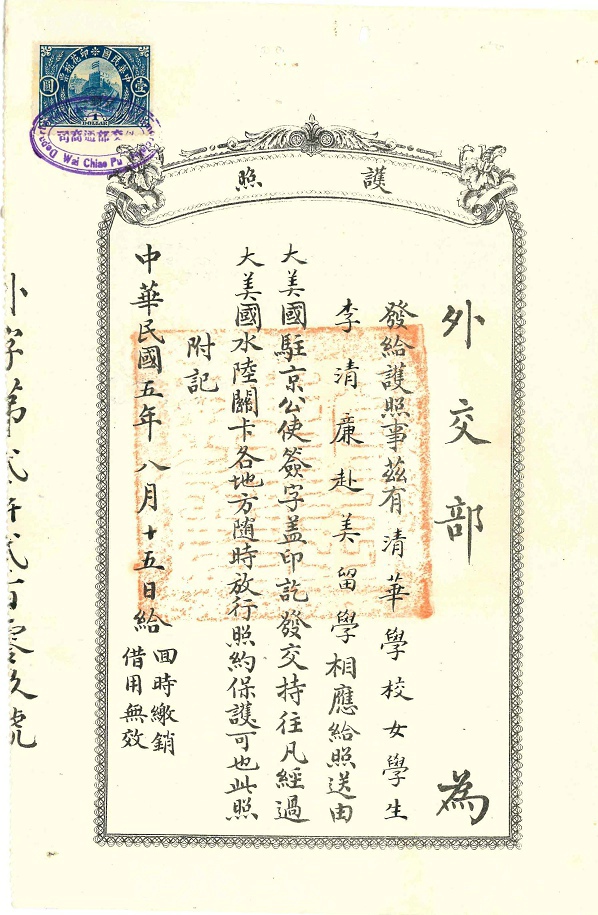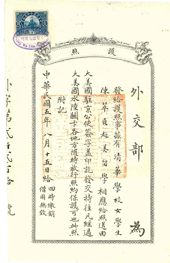 护照都是北京发的,那时北京还是民国首都,所以美国公使驻北京。跟上海发的不一样,而且这里的是专为清华官费学生开据的护照,可能是为庚款学生专案专办。