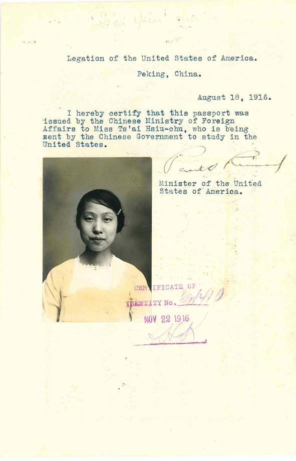 第6名 蔡秀珠,18岁半,Ts'ai Hsiu Chu,生于苏州,档案名称:Tsai, Hsiu Chu - Case Number: 15597/22-6 - Ship of Arrival: CHINA, 09/30/1916 ,ID=28832207。4页同上。联系人:Mr.Tsai Hsiu Tsz Mo Kyuin Aung Huchow,湖州,Aung估计是hung--巷。