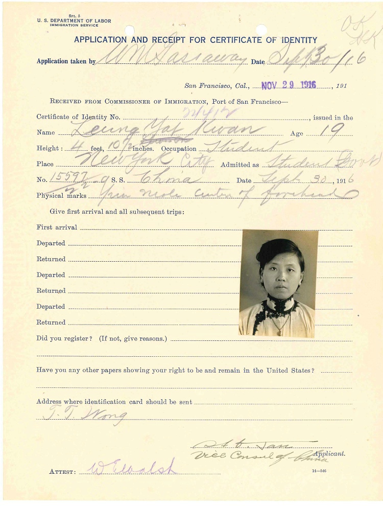 第9名,梁逸群,Leung Yat Kwan,19岁10个月,看名字就知道是广东人,逸字跟孙逸仙的逸字拼法一样,Yat,档案名称:Leung, Yat Kwan - Case Number: 15597/22-9 - Ship of Arrival: CHINA, 09/30/1916 。ID=28832212,4页。联系人,Mr.Leung Lau(?), 地址是Shu Wu Pu Peking,庶务部街?北京有这么个街吗?