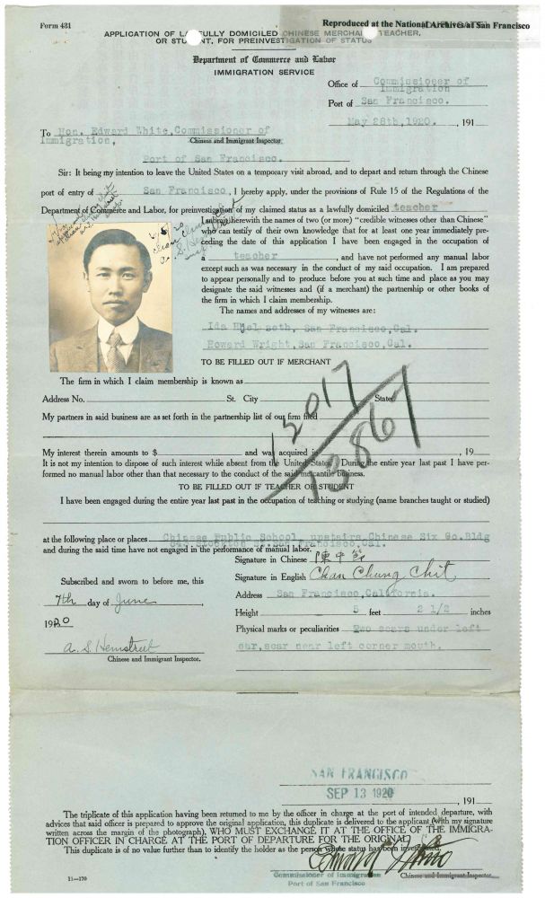 陈中节是教师(p3),档案里有一张他1920年申请的表格431(Form 431),是合法居美的商人,教师,学生等离美时申请返美证。陈中节职业为教师,学校地址列为Chinese Public School,upstairs,Chinese Six Co Bldg 843 Stockton St. San Francisco Cal.,这里提到的Six Co. 指中华会所,由6个会馆组成,可能是那个年代旧金山最大的华人组织。p32是Form 431,返美证申请