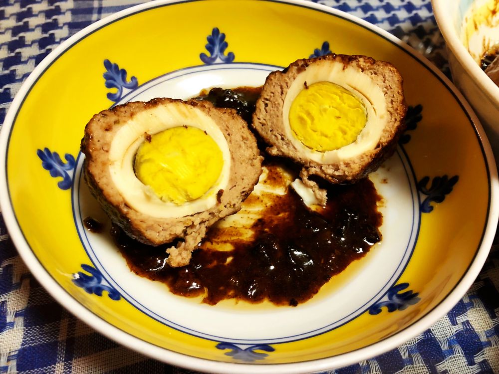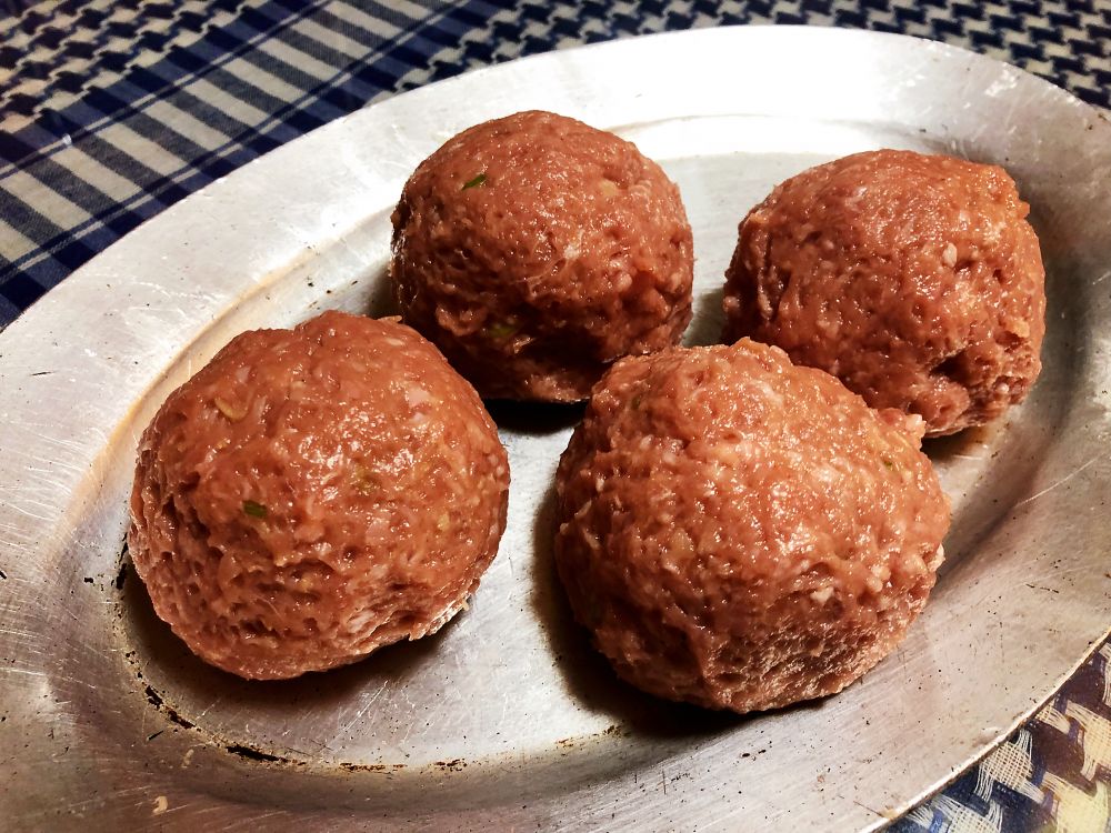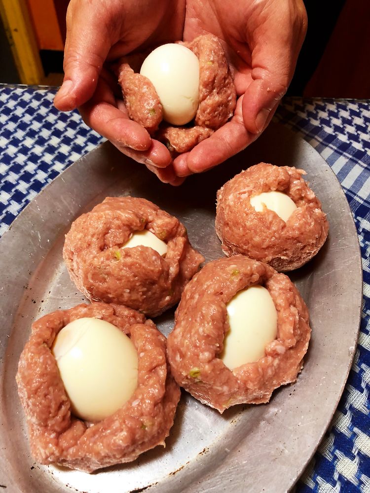 猪肉合拢,把煮熟的鸡蛋包好,呈狮子头状。