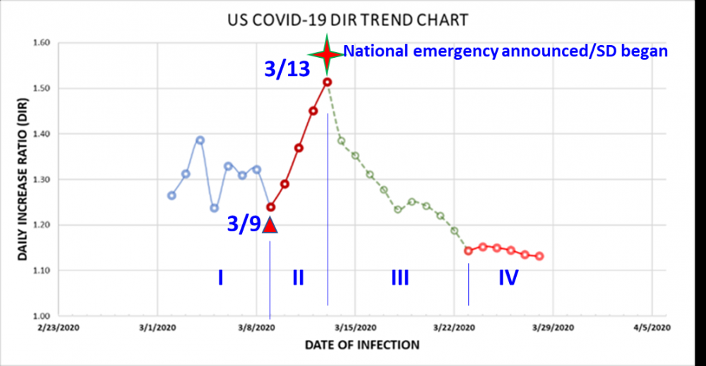 4). On 3/23/2020, 10 days after the NE announcement, the data suggests that the DIR downward trend changed its course and became much flatter as suggested in the 5 consecutive data points till now at the time of this report writing. This Stage IV is termed as the Stagnation Stage.