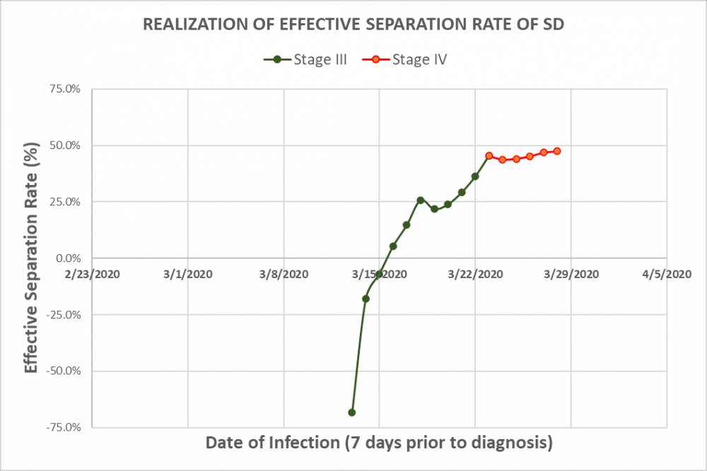 To understand the transition from Stage III to Stage IV, the Effective Separation Rate (ESR) is analyzed. ESR is defined as the number of eliminated transmission paths as a percentage of the number of the transmission paths at a reference state. The reference state is chosen as the one in Stage I (when people have a “normal” life). A negative rate means more crowded gatherings or clusters and a positive rate indicates the opposite. It is noted that Stage III traverses 10 days which is about 2 transmission spans (transmission span is the interval between the infected date of a carrier to the date of infecting others, generally 4 to 5 days statistically). Figure 2 shows that after SD practice started, the ESR started to increase day by day to realize its effect. After 10 days, or two transmission spans, the total effect became matured and reached its max at a level about 45% on 3/23/2020. In practice, SD significantly reduced the office gatherings, and the crowds found in the service sectors (such as Gyms, Pubs, Coffee Shops and such) but does not eliminate family clusters, small gatherings (presumably no more than 5), those found in the public transportation vehicles, shopping gatherings, and small groups of street pedestrians as well as found in recreational parks.