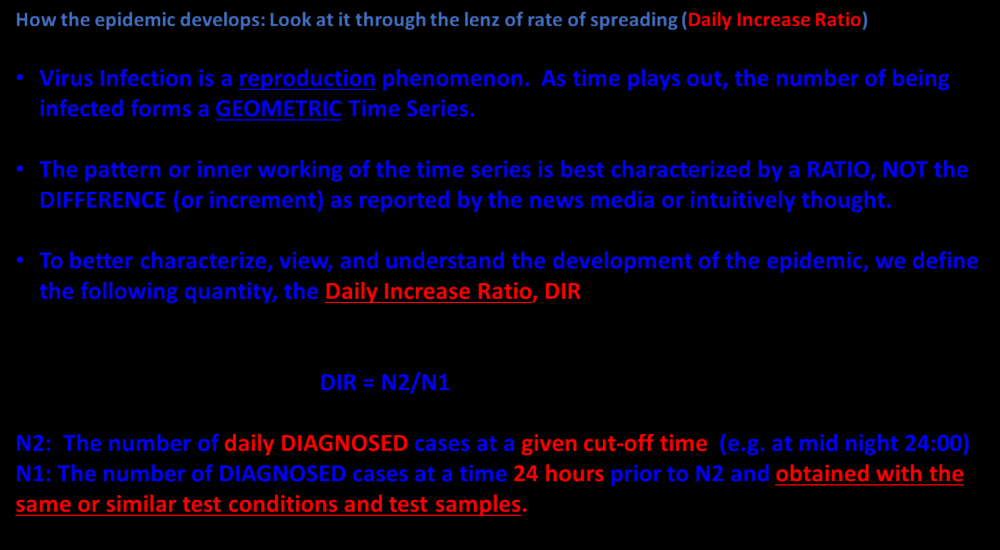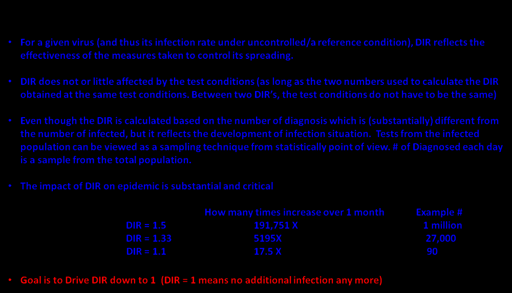 Two necessary factors must be in place for an infection to occur: Infection Source and Transmission Path. Out of the 310,000 being diagnosed, a crude estimation suggests a 15 to 30 multiples would have been infected. Even though about 13% of the diagnosed ones are currently hospitalized, a huge amount of carriers are being mobile in the population. Even though through SD, there is a commendable 50% ESR has been created, there is still about 50% transmission pathways being open. Even with the currently reduced DIR of 1.12~ 1.15, when operated on this large base, the a prohibitively large amount of new infections will be generated on a daily basis. When this daily increased carriers added onto the already large base, the following day’s increase will be even larger (until the so called inflection point occurs). For example, on the DIR peak day, when the DIR was 1.51, the daily increase was 4849. While on 4/4/2020, the DIR was 1.12, the daily increase was 34405. A 7 times of daily increase due to the much larger base number. This shows that the current primary driving force of infection is the large base itself.