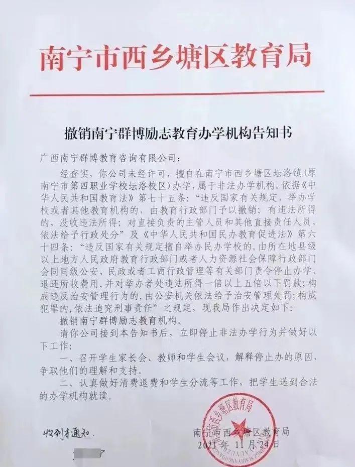 2021 年 12 月 2 日,新京报记者从南宁市西乡塘区教育局获悉,目前主管部门已下发撤销告知书,要求群博励志学校立刻停止非法办学行为,并做好学员遣散和安抚工作。案件中涉及违法的,将依法移交司法机关查处。