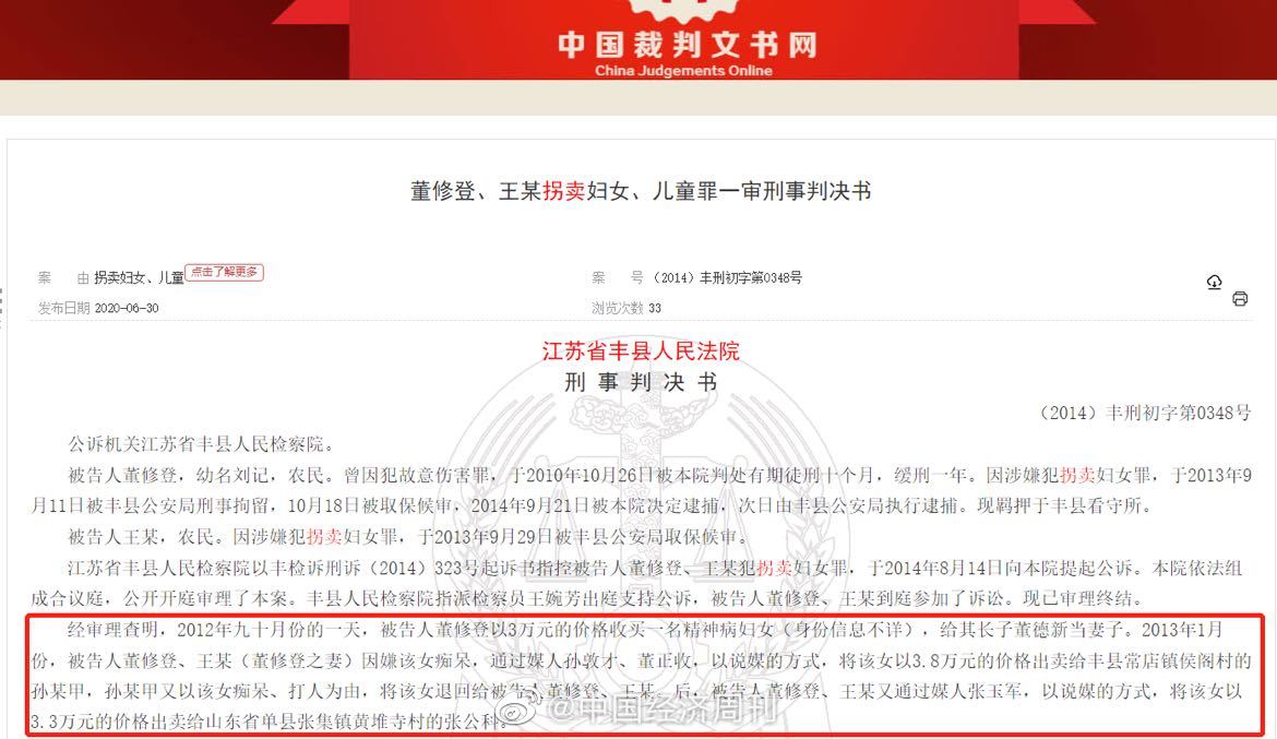 2020年6月30日,中国裁判文书网发布了丰县人民法院2012年作出的一份拐卖妇女罪的判决:被告人董某登犯拐卖妇女罪,判处有期徒刑五年。王某犯拐卖妇女罪,判处有期徒刑三年,缓刑三年。