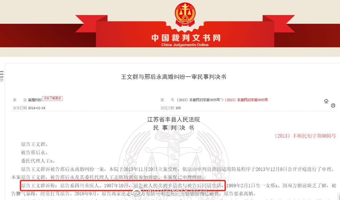 中国经济周刊—经济网讯 (记者 孙庭阳) 在中国裁判文书网上,曾披露过数例徐州丰县人民法院判决的被拐卖妇女起诉的离婚案,均不予支持离婚。