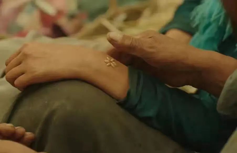 收了麦子,老四用麦粒在贵英手腕上摁下一朵麦粒花:“我给你种了个花,做了个记号,你跑到哪里就都丢不掉了。”