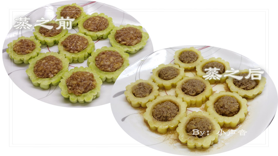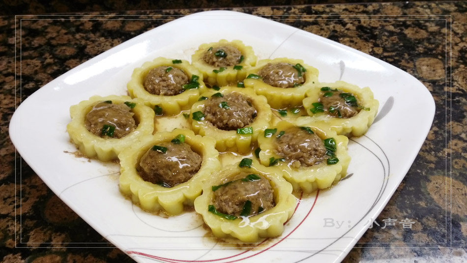 哦,有缘也做了苦瓜酿肉,很高兴有缘也喜欢这道菜,其实,有时候我偷懒,肉馅里加入了各种调料,蒸好后就可以直接吃,不用淋汤汁。(淋点汤汁主要是为了更漂亮一点 ^o^)
