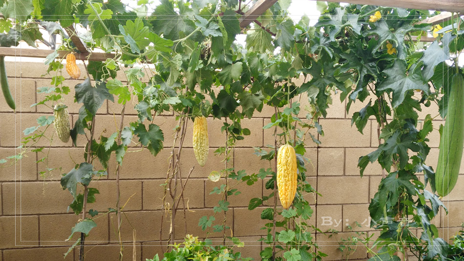 的确,加州气候好,适合植物生长:)),亮亮妈看得仔细,那个架子的确搭的比较高大,另一头种的葡萄,原以为葡萄会爬过来,结果,架子太长大了,还有富于的空间,就种了点苦瓜丝瓜等:))