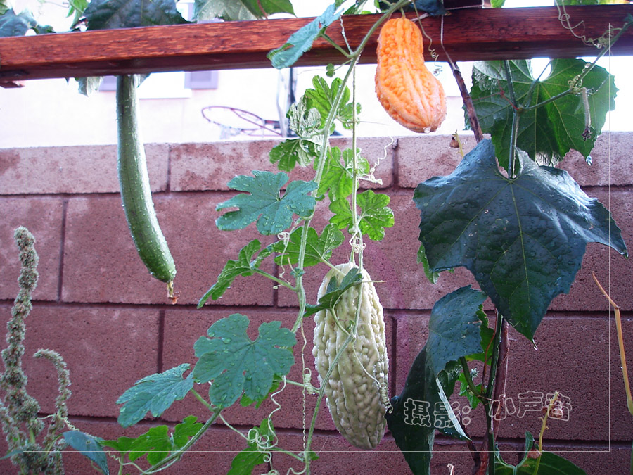 再来几个远镜头看看我种的白玉苦瓜~~~~,只是在角落里种了一棵,它不断的分枝分藤,最后藤蔓爬满了整个架子,和我种的丝瓜、豆角混为一架,瞧瞧这架子上又是苦瓜,又是丝瓜,还有豆角。。。。。,热闹极了,哈哈!:))