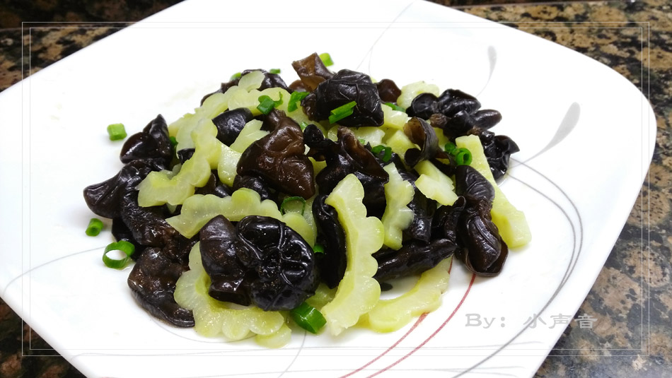 4. 将苦瓜、木耳、盐、糖一起拌匀,淋一点麻油,撒上一点葱花即可。