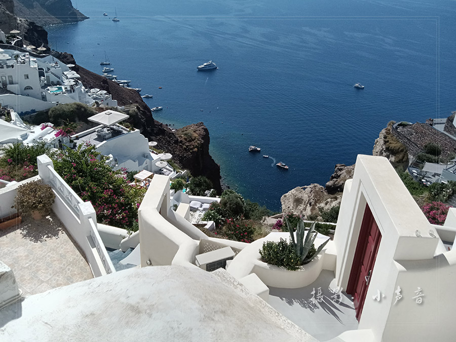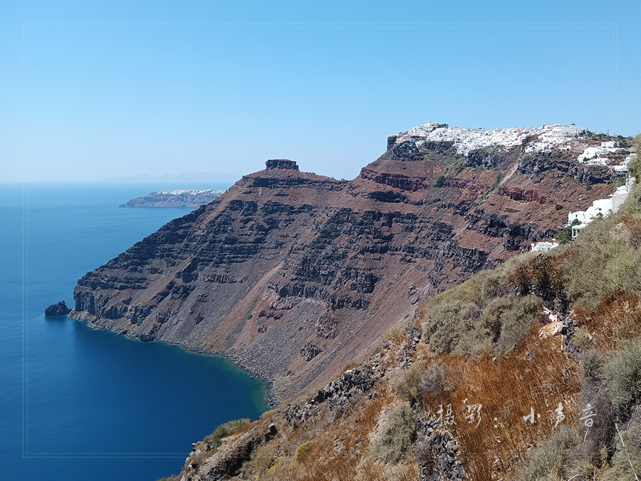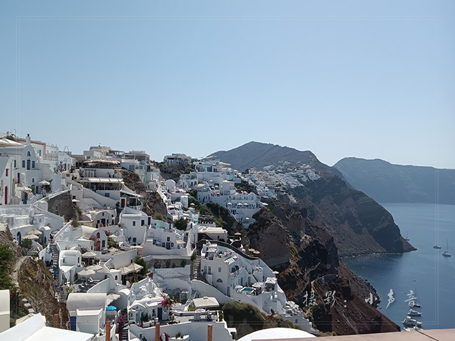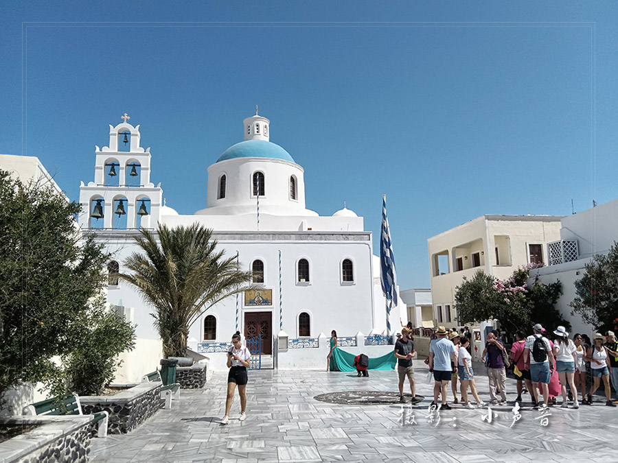 悬崖峭壁旁白色的房子和蓝屋顶的教堂比比皆是,在蔚蓝的天空下和碧蓝的大海上筑起了一座蓝白色的天堂,美得让人惊叹窒息目眩神迷!