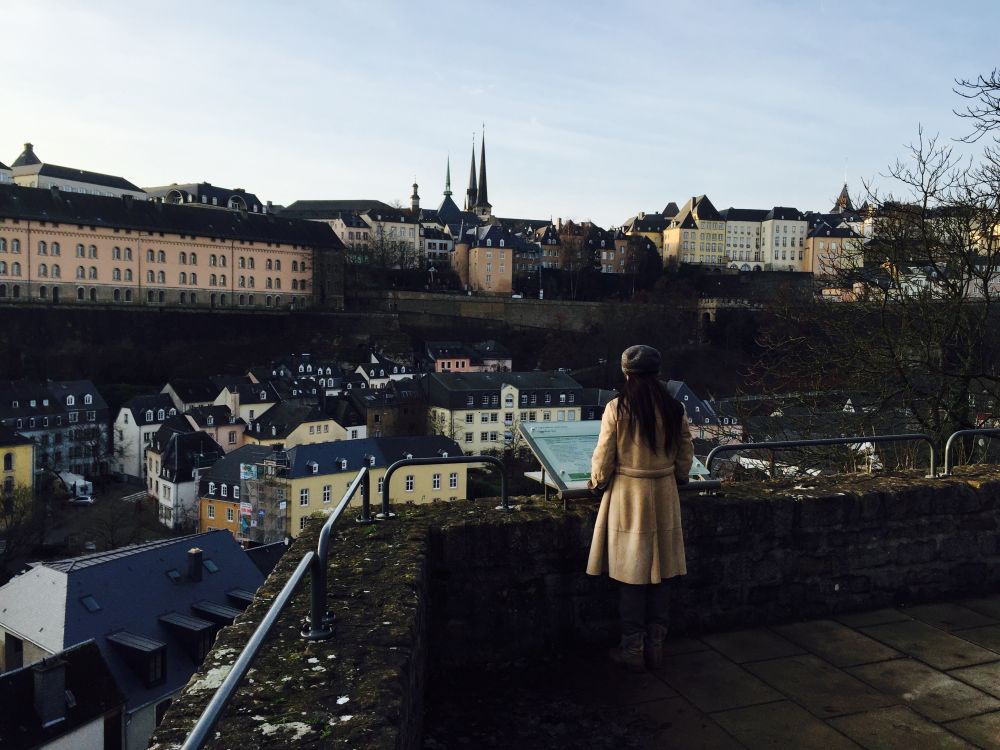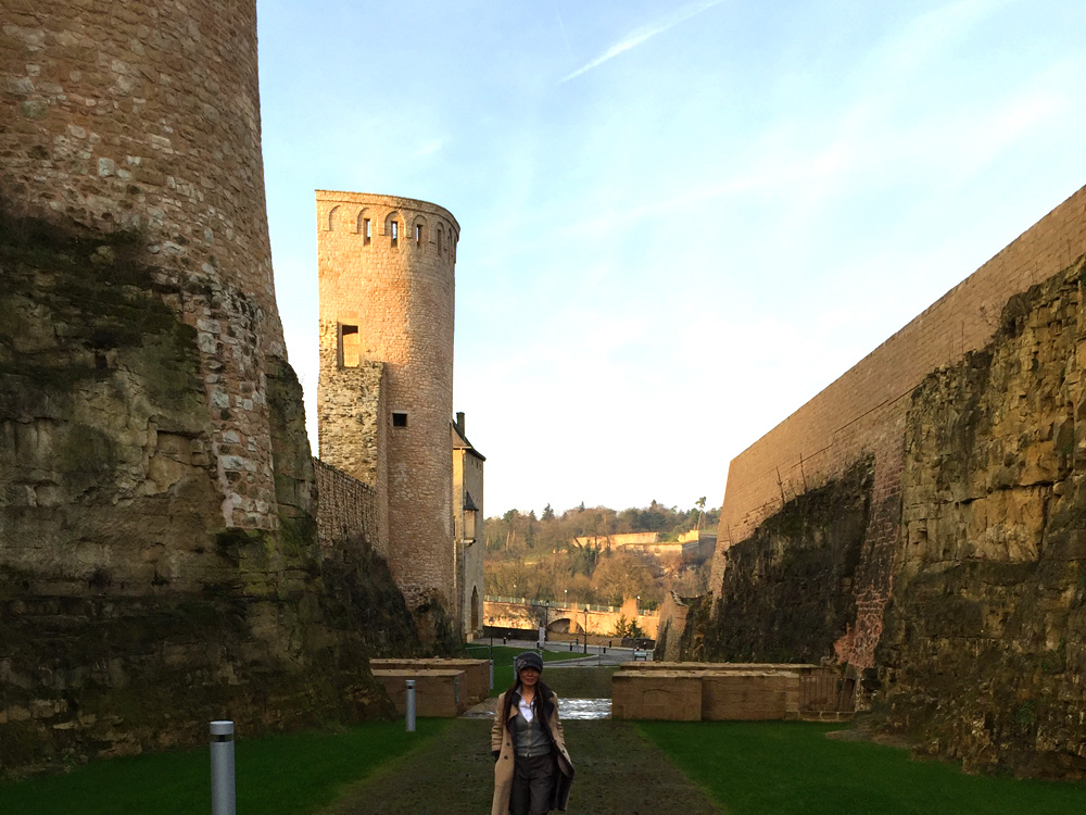 是暖冬的天气。我们亳无目地走在金黄色的阳光里。因为目的是去探亲,事先也没有好好去查一下卢森堡的历史背景和景点。就随意地一路看着黄色墙面的老房子的街景、不远处大桥,一路走进老城里。路过很多断垣残壁,因为冬天,没有绿化的陪衬,都裸露在天底下,据说是古时的碉堡Casemates cu Bock留下的痕迹,基本上组成了这个城市的基调。当时有阳光照在微黄的石砖壁,印象很深。那天从头到脚穿了Brunello Cucinelli的行头,暖暖和柔软的,又有古典的低调,觉得特别应景。